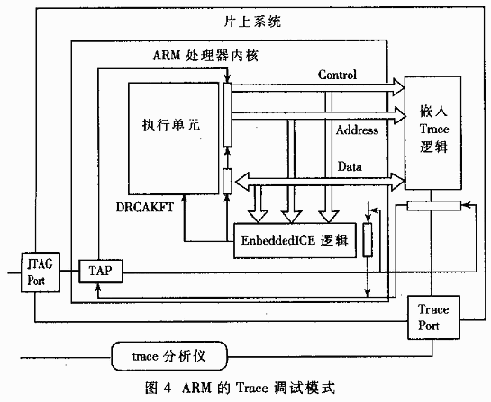 实时监控则是进一步在ARM9E和ARM10中的改进。它改变EmbeddedICE在触发中断后时入调试模式状态而停止内核运行的弊端,进入一段非常小的中断监控程序中,得到所需要的信息后迅速把控制权转让给先前的任务(这是与远程监控器最大的区别)。在监控程序内处理器完全可以再接收外界的中断和其他触事件,而不是停止运行。这种方式综合了JTAG和远程调试的优点,它可以增加以下两个好处: %26;#183;在不禁止中断的前提下调试前景任务(即中断时正在运行的任务); %26;#183;不用停止处理器的运行就可以读写和修改存储器(对于机电设备非常重要)。 更为强大的是ARM的实时跟踪解决方案,它由三部分组成: %26;#183;嵌入跟踪微核; %26;#183;跟踪分析仪; %26;#183;跟踪调试软件。 通过这三种工具可实现完全的实时跟踪。跟踪微核存在于芯片,它可以不停止CPU的运行而实时监视芯片总线的信息,并把设定触发范围内的所有信息在CPU运行的同时通过压缩的方式送到外部的跟踪分析仪器里。分析跟踪仪器从芯片外部通过跟踪口(另外一个不同于JTAG的接口)收取信息。因为是压缩的数据,所以分析仪不需要采用与跟踪微核实时跟踪相同的速度。这大大降低了分析的成本,并增加了存储的容量。而PC端的跟踪软件则来自分析仪的数据重新组织起来,从而重现处理器的历史状态和数据、程序流程。同时还可以把执行代码与源代码链接起来,使调试者快速理解跟踪数据。ARM的这种方式通过芯片内部的实时跟踪硬件加上低成本的分析仪器,解决了传统在线仿真器(ICE)和逻辑分析仪的诸多弊端。其示意如图4。 3 Nexus标准 自从JTAG IEEE1149.1标准出来后,越来越多的高端嵌入芯片生产商开始采用这个标准。但是1149.1标准只能提供一种静态的调试方法,如处理器的启动和停止、软件断点、单步执行、修改寄存器,而不能提供处理器实时运行时的信息。于是各个厂家在自己的芯片上,把原有的JTAG的基本功能进行了加强和扩展,如前面提到的E-TRACE、背景调试模式BDM(Background Debugging Mode)和片上仿真OnCE(On-Chip Emulation)等,在处理器不停止运行的前提下,进行实时的调试。 由于这些增强的JTAG版本之间各有差异,而且即使同一厂家的不同产品之间也在存着不同。所以一些芯片厂商和调试工具开发公司于1998年成立了Nexus 5001论坛,以期提出一个在JTAG之上的嵌入式处理器调度的统一标准。