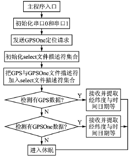 与上面提及的两种i/o模型不同的是:在这个处理过程中,使用了两次系统调用来达到读取数据的目的。虽然两次系统调用的开销似乎更大,但它的最大好处在于能同时等待多个描述符准备好。因此se-lect调用功能更多地是借助了内核来监听i/o设备描述符的。下面具体介绍se-lect函数的功能及应用。 3 uclinux中基于se-lect的i/o复用机制和工作原理 在系统存在多个输入或输出流但不希望其中任一个流被阻塞的场合,经常使用复用i/o的方法解决。uclinux中,用户程序多使用se-lect机制实现i/o复用控制,se-lect函数允许进程对一个或多个设备文件进行非阻塞的读或写操作。 se-lect的函数定义于 int se-lect(int n, fd_set *readfds, fd_set *writefds, fd_set *exceptfds, struct timeval *timeout); 该函数允许进程指示内核等待多个事件中的任一个发生,并仅在一个或多个事件发生或经过某指定的时间后才唤醒进程。该函数的第1个参数n表示文件描述符集合中最大值再加1;第2个参数readfds,表示可读的文件描述符集合,用于查看是否有可读取数据;第3个参数writefds表示可写的文件描述符集合,用于查看是否能写入数据;第4个参数exceptfds用于异常控制;最后一个参数timeout决定了se-lect将会阻塞多久才把控制权移交给调用它的进程。调用se-lect之前,必须对此参数进行初始化。若timeout值为0,则se-lect直接返回0。此时i/o操作没有等待就立即返回,相当于一种非阻塞i/o的调用。 在应用中,通常先调用se-lect查看哪个i/o设备可读/写。如果没有可读/写的设备,并且没有设置超时返回功能,那么进程将阻塞在se-lect调用上;如果有,则se-lect函数返回,紧接着可通过测试参数readfds和writefds来确定哪个i/o设备可读或能写,而后以非阻塞方式操作该i/o设备,从而实现期望功能。 在实现se-lect应用的过程中,还会使用到这些se-lect相关接口: void fd_zero(fd_set *fdset); 其中,fd_set表示设备文件描述符集合,fd表示设备文件描述符。fd_zero函数用于清除设备文件描述符集合所有元素;fd_set函数用于把某个文件描述符添加至文件描述符集合;fd_clr函数用于从文件描述符集合中删除某个文件描述符;而fd_isset用于检测设备文件描述符集合的某个文件描述符是否有效,有效则表示该位对应的设备有数据可读或可写。 4 轮询检测方法与se-lect方法的比较 4.1 轮询检测方法 轮询检测方法是指对串口进行非阻塞的读写操作。当操作未成功时,让进程或线程挂起一段时间,然后再使用非阻塞调用来重新查询串口是否有可读/写数据。用此方法,相当于系统不断地对接收或者发送操作的执行结果进行探测,直到把数据发出去或者接收完成定量的数据,才退出此轮询循环。而对于接收与发送不确定哪个时刻会到达的情况,即随机性比较高的读/写操作,采用轮询方法会造成cpu资源浪费。如果轮询频率过低,则会使系统少接收一部分数据或接收过慢;反之,则接收方会因为等待太久而不能接收更多新的数据。轮询频率过高的情况,会让cpu过度频繁地查询串口状态,造成过多的耗用cpu执行周期,降低其利用率。 4.2 se-lect机制能充分利用系统时间的原因 与频繁调用非阻塞读写函数来轮询监听i/o的方法相比, se-lect调用允许用户把进程本身挂起来,同时使系统内核监听所要求的一组文件描述符的任何活动。只要确认在任何被监控的文件描述符上出现活动,se-lect调用将返回指示该设备文件已经准备好的信息。这样就使进程能相对实时地监测到i/o设备上随机的变化,而不必由进程本身去探测输入数据是否准备好。 5 利用se-lect i/o的机制实现gps与gpsone数据的接收 本文提出的基于gps与gpsone信号的双定位的解决方案,即对系统两个串口定位信号的监听与处理,充分利用uclinux下基于se-lect的i/o复用机制,更利于较复杂系统的控制和管理。 方案实现的程序流程如图4所示。