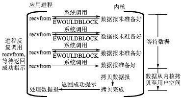 2.2 非阻塞i/o 图2中,在非阻塞i/o模型下,i/o操作是即时完成的。当进程调用read函数时,设置了o_nonblock标志,那么即使串口没有数据可读,read函数也会立即返回。此时其返回值为eagain,表明串口数据未就绪。如果串口有数据可读,则read函数会读取该数据,并返回所读数据的长度。通常轮询i/o的方法就是采用这种模型来读取串口数据的,此时进程必须通过反复调用来检测是否有数据可读。如果轮询频率过低,则容易丢失数据;轮询频率过高,则占用太多处理器的处理周期。