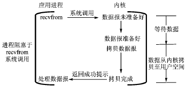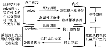 2.3 i/o复用 上述两种i/o模型,是最常用的两种操作i/o的方式;但在面向较复杂、需要处理多个i/o的系统时,这两种模型存在着不足之处。例如:在应用进程中需要对多个i/o设备进行监听,当某个设备可读或可写时,进程能马上得知,并进行相关处理。这时若采用阻塞方式操作i/o,则进程会阻塞在某个设备的i/o读写操作上而不能适用于这种情况;若采用非阻塞方式,则往往需要定时或循环地探测所有设备,才作相应处理,这种作法相当耗费系统中央处理器的执行周期。可见,上述的两个i/o模型都不能满足这类应用,故此需要引入一种特别的i/o处理机制,即i/o复用。 所谓i/o复用,是指当一个或多个i/o条件(可读、能写或出现异常)满足时,进程能立即知道,从而正确并高效地对它们进行处理。 在uclinux下,系统提供se-lect函数和poll函数,用来支持i/o复用的实现。如图3所示,若使用se-lect的系统调用来查询是否有数据可读时,进程是在等待多个i/o描述接口的任一个变为可读,但此期间并不阻塞进程。当有数据报已准备好时,返回可读条件,并通知进程再次进行系统调用准备读取相应的i/o数据。此时内核就开始拷贝准备好的数据至用户空间,并返回指示进程处理数据报。