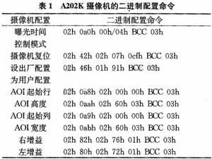 本文以BASLER A202k面阵 CCD摄像机的配置为目标设计嵌入式摄像机配置系统。BASLER公司提供了2种摄像机配置方案:一是利用该公司提供的摄像机配置软件CCT+(Camera Configuration Tool Plus),二是利用该公司提供的二进制配置命令,由用户编程实现。本文采用二进制配置命令,通过设计的嵌入式系统配置摄像机。该摄像机的二进制配置命令帧格式如下: 起始字 描述字 数据段 BCC 结束字BCC是块检查字(Block Check Character),需要由用户计算。主要的配置命令及其二进制帧格式如表1所示。