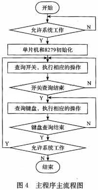 3 软件设计 软件系统的总体思想如下:首先对单片机和8279进行初始化,然后通过单片机,把不需要调整的命令送到摄像机对摄像机进行控制;再写进另一部分命令,先给一定的初值,送到摄像机,可以根据需要随时通过键盘进行调整,这部分命令一直存储于单片机的RAM。然后单片机不断查询键盘和开关,一旦有动作,就调用与动作相对应的子程序进行相应的处理。主程序流程图如图4所示。