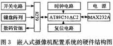 2 硬件设计 由于高的性价比,单片机广泛应用于信号检测、信号处理、数据采集和控制系统中。设计的系统以AT89C51AC2单片机为处理器,以拨码开关、键盘阵列为调节输入,以数码管作为显示输出。同时利用了键盘/显示芯片Intel 8279简化系统设计。串口芯片选用MAX232A。系统工作时钟为11.059 2 MHz,整个系统采用+5 V单电源供电。系统的硬件结构图如图3所示。