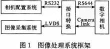 设计的摄像机配置系统所在的图像处理系统框架如图1所示。 其中RS232和RS644是控制通道所用的协议,即摄像机配置系统的通道; LVDS和Camera Link是数据通道用到的协议。 根据所在系统的通道协议和摄像机的配置命令,同时考虑到必要的人机交互,设计了摄像机配置系统3大模块:数据处理模块,对二进制配置命令进行必要的处理;通信模块,通过RS232串口收发摄像机配置命令;人机接口模块,用于对摄像机配置的调节更改以及配置参数的显示。此外还有支持处理器工作的时钟、电源等。系统的结构如图2所示。 系统的工作原理为:处理器接收数据输入,根据接收到的输入执行相应的操作,通过串口读写配置命令,从而达到对摄像机的配置调节,并根据需要显示配置参数。