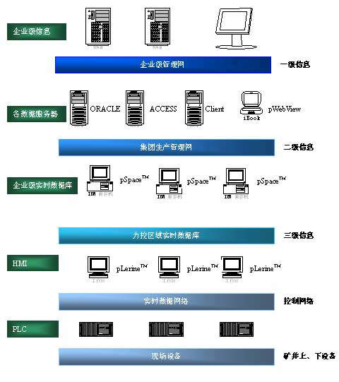 | 一、 概述 生产数据是生产正常运转的根源。如果数据流能够很容易地从生产过程到达决策者的计算机上,就可以快速地作出更为灵活的决策。在中国的煤矿中是以集团为中心,各采区为分矿。一个煤矿集团要包括多个分矿,同时覆盖的地域较广,各矿与各矿之间的距离较远。 为了实现对各分矿的矿井上、下实时生产数据的监测主要以网络为平台。在现场中,采用多种不同的控制采集设备,其中通风、瓦斯主要以KJ系列的产品为主,其它还有PLC、DCS等,这就要求监测软件支持多种通迅协议。 从各分矿到集团采集的信息分为三级,一级信息是指由集团公司汇总、掌握的有关全集团公司的指标信息,二级信息是指由各矿汇总、控制的有关各矿井的指标信息,三级信息是指由各矿采集的各水平、采区、基层单位(区队)的指标信息。 二、系统方案 系统从分矿到集团采取如下结构: ![]() 在各分矿现场,井上、下数据采集可以通过KJ系列产品或其它控制设备进行采集,其中采用KJ系列采集的拓朴图如下: ![]() 现场实时监测数据通过其它控制设备实现,其拓朴图如下: ![]() 三、系统功能 1、 各矿井用三维力控的HMI/SCADA---pLerine将现场各控制设备的数据采集到工作站,其中pLerine: * 目前支持的I/O设备包括:DCS、可编程控制器(PLC)、智能模块、板卡、智能仪表、控制器、变频器等等。另外,也支持DDE和OPC接口,可以和采用DDE或OPC标准的设备通讯。 * 在工作站中pLerine可以实现实时数据显示、动画、历史趋式、实时趋式等功能。 2、使用pSpace与pLerine中的区域实时数据库相连接,力控®企业级实时数据库pSpaceTM是一个高性能、高速度、高吞吐能力、可靠性强、跨网络系统的开放式实时数据库软件。在pSpace中实现的功能有: * 数据分析 * 分布式实时数据库映射 * 分布式事件查询 * 分布式数据检索 * 实时报警 * 基于Web的企业解决方案 * 与 oracle及access等数据库的接口 * 毫秒级的历史库 * OPC Server * 万能报表 * 与系统中其它组态软件集成 3、pWebView在客户终端上, pWebView不需要特殊的驱动程序或支持软件。只要您的客户端工作站已经连接到了Internet或Intranet上,在浏览器上输入Web服务器的网络地址,就可以开始实时地浏览现场生产过程。 四、系统的实现 利用pLerine、pSpace和pWebView相结合实现了实时采集、经济存储、安全应用等几个方面的问题,根据pLerine、pSpace、pWebView相结合的解决方案(如下图)完全可以作为生产实时数据库和生产信息化数据库平台来应用。