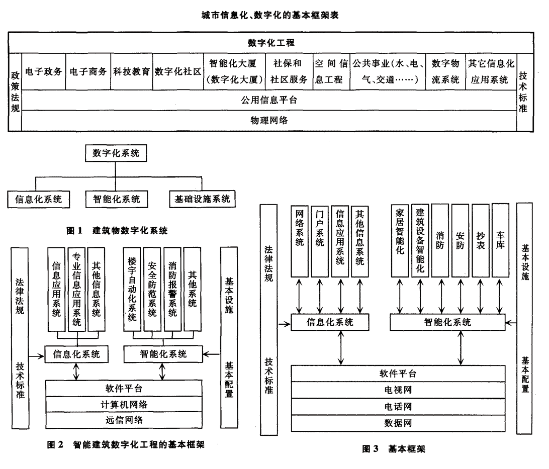 | 沈阳、数字济南、数字青岛、数字长沙甚至还出现了数字中山、数字襄樊、数字白城等。 2002年3月,建设部科技司在天津塘沽再一次召开“建设领域信息化项目计划及示范项目”评审会,会上有更多的城市提出数字化城市的建设规划。目前专家对数字化城市的定义、技术内涵、特点及系统基本达成了共识,数字化城市是通过信息网络将城市中的各种信息收集、整理、归纳、处理、分析和优化,进而对城市的资源、环境、生态人文和社会等方面进行数字化,为社会各层面服务。 2.3 数字化城市的基本内涵 城市数字化是利用现代化的信息技术、计算机技术、网络技术、通信技术和多媒体(图形、图像、视频等)技术,将城市活动中的众多信息“孤岛”,通过现代化的通信基础设施——“信息高速公路”连接起来,以达到信息资源采集、加工、融合和共享,决策支持的信息化和科学化、公众化、规范化、法律化的目的,提高城市的生活和管理素质,同时以城市信息化、数字化为基础,逐步实现地域信息化和数字化,以至全国的信息化和数字化。包括网络构架、系统运营、解决方案、软件产品、技术支持;其行业包括:政府、企业、金融、电信、交通、建筑、商业、科教文化、服务(生活、娱乐、体育、文艺)等等,城市信息化、数字化的基本框架如表所示。 (1)信息化的基础设施以光缆为基础首干的宽带城域网,即人们常说的“城域信息高速公路”。一般可以分为三层,首干层:以光缆为基础的宽带城域网,一般是ATM技术或DWDM技术。带宽可以是155M、622M、2.5GB、10GB等;汇聚层:以光纤/小同轴/双绞线,其技术是ATM/FR;接人层:可以是宽带接人XDSL/HFC/ETHERNET,也可以是窄带接人信息化的核心;服务:电子政务、电子商务、安全、公共事业、数字化社区、电子社保、智能大厦(数字化大厦)、电子商城、接人服务、其它增值服务;支付平台;专用服务。 2.4 数字城市的关键技术 (1)计算机网络技术:网络体系结构与协议、网络的分类、网络与标准、网络互联技术与设备、网络协议一致性测试、网络软件、网络管理; (2)宽带接人技术:XDSL接人、HFC接人、LAN接人、卫星宽带IP接人、地面无线宽带IP接人、地下通信; (3)信息安全与保密技术:信息系统安全性要求、信息系统安全技术、信息系统安全性保障、Internet网络安全;安全性测试评估与认识; (4)管线与布线技术:布线系统的设计、布线系统的安装、管线系统设计; (5)GIS技术:GIS基础软件和应用软件、GIS网络、GIS数据库、三维GIS; (6)软件工程:软件开发和文档规范、软件测试、软件维护、软件质量保证、软件配置管理、软件质量体系认证、软件过程评估、程序设计语言标准、操作系统; (7)门户技术一门户系统(信息整合):门户平台的总体结构、门户平台的开放性、系统架构的可扩展性、门户系统的安全性、多级门户技术、统一用户管理、统一授权管理; (8)数据库技术:数据管理“参考”模型、数据库开发规范与接口、特种数据库、数据挖掘与数据仓库、异构数据库信息共享、数据库设计、数据库安全标准、数据库管理系统; (9)电子商务技术:电子商务定义、电子商务标准化基本构架、电子商务通用技术标准、电子商务Internet相关标准(文本技术,安全技术,电子支付知识产权)、电子数据交换、电子商务标准的维护和管理、电子商务的安全认证、电子商务一致性测试和认证; (10)电子政务技术:电子政务定义、电子政务标准体系框架、电子政务通用技术标准、电子政务Internet相关标准、电子政务标准的维护和管理、电子政务一致性测试和认证、电子政务的数据元和数据交换、电子政务的安全认证; (11)原始信息采集质量控制技术:采集程序与质量要求、基础数据元定义与目录、数据元目录审查与登记、数据的维护与管理; (12)信息分类与编码技术:信息分类编码体系表、信息分类编码的基本原则和方法、信息分类编码的管理; (13)IC卡技术:IC卡的分类、IC卡的标准和基本规范、IC卡测试、IC卡接口设备、IC卡的安全策略; (14)无线通信技术:IEEE802.11协议、HomeRF工业标准、蓝牙技术; (15)数字视频传输技术压缩及解压技术:VOD技术、MTV技术、DCCTV技术; (16)现场总线技术:现场总线定义、现场总线特点、现场总线分类、现场总线标准协议、现场总线的应用; (17)工业以太网技术:工业以太网定义、工业以太网标准、工业以太网特性(实时性、可靠性、安全性、供电); (18)生态技术(节约能源、防止污染、保护生态):选址、交通、绿化、空气质量(污染集中排放、汽车尾气、油烟机……)、噪声污染、日照采光、改善微环境以减少热岛效应、节约能源、水环境设计、新材料、新技术、新工艺; (19)数字物流技术。 3 智能建筑由智能化到数字化 3.1 建筑物数字化系统 数字化系统包括信息化系统、智能化系统、基础设施系统,其关系框架如图1所示。 3.2 建筑数字化的基本框架(如图2所示) 3.3 建筑及住宅社区数字化技术标准 (1)2003年1月成立《建筑及住宅社区数字化技术应用》——国家标准编制委员会; (2)标准编制内容:该标准是在建设部信息中心编写的“数字化社区示范工程技术导则”基础上编写的,共有四部分内容:建筑及住宅社区控制网络通讯协议;建筑及住宅社区运营服务数字化技术应用;建筑及住宅社区数字化技术应用系统检测验收;建筑及住宅社区物业管