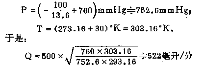 利用(5)式,可见很方便地在现场从流量计读数求得被测介质实际流量值。需要特别指出,用(5)式计算时,P、P。、T、T。都应代入绝对值,而P是表前压,应在流量计上游侧、并紧靠流量计的管路部位测取。 例:使用某空气采样仪,运行时,采样仪上转子流量计读数为500毫升/分,测表前压为—100mmH 20(因使用抽气泵,所以是负压),现场温度为30℃,求此时空气的实际流量值。 解,根据测定的数据,有