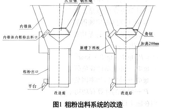 | 德州晶华集团大坝有限公司2 500t/d预分解窑生 产线的原料粉磨系统采用φ4.6 m×(10+3.5)m中卸 烘干磨,配用TLS3100高效组合式选粉机。该系统自 投产运行后一直比较稳定,生料磨产量稳定在200t/h, 选粉机电流一直保持在210~220 A。但自2006年6月 开始,选粉机电流突然升高,电流在几分钟内增加 到380~395 A,造成选粉机过载跳停。这种现象一天 发生3~5次,严重影响生料磨的台时产量,甚至造 成回转窑低产量运行,增加熟料的生产成本。 1原因分析 当选粉机电流突然升高时,粗粉提升机电流急 剧下降,成品入库提升机电流略有变化;此时细磨 仓磨音开始变响。这说明选粉机电流突然升高是因 粗粉下料不畅,选粉机内部负荷过大所致。 2006年由于原材料涨价和公路限吨的影响,我厂 石灰石供应不足,为此我厂从6月开始,采用工业废 渣一电石渣代替部分石灰石进行配料。由于电石渣粘 性大,流动性差,粗粉在粗粉回粉管道内流速减缓, 大量的粗粉不能及时排出,特别是在平台处易积料, 这是粗粉管道下料不畅的主要原因。 2采取措施 2.1改造粗粉出料系统 (1)在内锥体内粗粉出料口下面焊结一块倾斜钢板 ![]() (2)将选粉机粗粉出口处平台去掉 (3)重新调整粗粉回料溜子上重锤双翻板阀的配重,使其反应灵敏,动作灵活,防止因翻板阀活动不灵而造成积料。 2.2加高选粉机内部风管 将选粉机下部内风管加高200 mm(见图1),以防粗粉下料不畅流人风管而被气流再次带人选粉机,引起选粉机内部负荷过大,导致电流升高。2.3固定反击锥,防止其晃动 选粉机的反击锥是用三根钢丝绳固定于上壳体上,反击锥和内锥体之间的环形间隙为25 mm,受含尘高速气流的冲击,反击锥有可能产生轻微的晃动,反击锥和内锥体之间的间隙发生变化,环形间隙变得不均匀,导致物料分散不均,选粉机选粉效率降低,循环负荷率增大,造成粗粉多,粗粉下料不畅。为此,我们采取三根角钢将调整好后的反击锥固定于内锥体上(见图1)。 2.4优化操作参数,提高选粉效率 (1)重新启用粗粉回料分料系统,按粗磨仓和细磨仓3:7比例进行分料,一是减少回细磨仓的物料量,防止回料溜子下料不畅,同时减轻细磨仓的负荷,提高其研磨能力;二是使一部分物料进入烘干仓、粗磨仓,改善物料在这二仓内的流动性。 (2)选粉机风量的大小与选粉效率、产量和细度的高低有着密切的关系。风量大,选粉效率高;细度粗,产量高。在生料细度方面,我们根据生产的实际情况作了适当的调整,生料细度80 um筛余由12%提高至14%,为此,我们增大循环风机进口阀门开度,由原来的60%提高至65%,同时将循环风阀门由原来的6%提高至10%,提高选粉机的选粉效率,降低其循环负荷率。 3结束语 从2006年6月中旬改造至今,再也没有发生过选粉机电流突然升高现象,生料磨产量稳定在210 t/h,为整条熟料生产线连续、稳定的生产提供了保障。 |