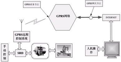 | GPRS技术是在现有的GSM系统上发展出来的一种新的分组数据承载业务,其最大优势在于它的数据传输速度大大提高,目前已达到了115Kbps。其次GPRS是按GSM标准定义的封包交换协议,可快速接入数据网络。它在移动终端和网络之间实现了“永远在线”的连接,网络容量只有在实际进行传输时才被占用。基于这些优势,GPRS技术适合进行数据传输,同时由于其可靠性,可以进行远程控制的设计。本文以油田抽油机为实际应用背景,介绍基于GPRS技术的开关磁阻电机调速系统远程控制的架构和具体实现。 系统整体结构 本系统是通过上位机操作系统,利用无线网络远程控制应用于油田抽油机的开关磁阻电机,控制开关磁阻电机的启动、停止、复位以及转速设定等参数,并对电机的运行状态进行采集,如电流参数、温度参数、转速信息、故障信息等,并将其返回到上位机操作系统进行分析,判断电机工作情况和下一步的控制情况,实现远程控制的目的。 本系统整体工作结构原理图见图1。  图1 GPRS远程控制系统整体结构图