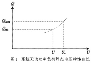 1.2 系统无功功率电源充足时的无功功率平衡 在正常情况下(系统电压为额定电压),如图2所示。系统无功电源Q同电压U的关系为曲线1,负荷的无功电压特性为曲线2,两者的交点a确定了负荷节点的电压Ua。
