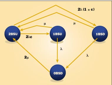 在网络应用中我们经常听到这样的讲法: 24(小时)×7(天)不间断工作。但怎样才能实现真正的不间断工作呢?一个可用性差的网络可能仅仅因为电源的一个尖峰脉冲或电源失效而导致系统瘫痪,要实现真正的24×7的可用性必须采用一些保护措施。 在这里需要澄清两个概念:可用性和容错性。其实可用性和容错性并非一回事。容错性包含有两层含义:任务处理的可靠性和系统的可用性。在仅有可用性要求时,目前许多系统都采用容错电脑,如文件服务器或呼叫处理等。但对于电信网络的记费系统或银行业务就需要处理的可用性。而对于那些能够容忍少些数据的丢失、或数据传输受可用的端到端协议如TCP/IP的保护应用来说,处理的可用性就显得不那么重要。 容错平台的传统实现方法通常包括专用硬件和专用软件,这会导致高昂的成本和漫长的设计周期,对于竞争激烈的电信市场来说,这是不能接受的。 什么是高可用性? 可用性并不是一个模糊概念,实际上它能用数学方法来精确地表示。简单地讲,一个高可用性系统就是一个用户能随时使用的系统,例如当用户需要在早上8点到下午5点启用该系统时,该系统就应该在这段时间内保证良好的可用状态,其余的时间可以用来进行定期维修保养。可用性常被定义为实际的服务时间和要求的服务时间的比值,常用百分比表示。许多现代化系统需要一天24小时、一年365天连续不间断运转(有时也称为7×24或365×24)。一个可用性为99.9%的365×24系统一年的平均故障时间为8.76小时(525分钟),而要想让系统的中断时间在一年中只有3分钟的话,系统必须有99.999%的可用性。 可用性指标可以利用所有系统元件的统计模型计算出来,最简单的元件模型是二元的,即元件要么处于工作状态,要么处于非工作状态。可用性可以用失效率来计算,结果为平均无故障工作时间MTBF,也可以用故障修复时间来计算,结果为平均故障修复时间MTTR。将MTTR时间平均分摊到MTBF周期内可以计算出任意元件对平均故障的贡献。例如,有一个对系统运作至关重要的元件,它的MTBF时间为250,000小时,MTTR为1小时,则系统在一年中的不可用性时间为2.1分钟(等于60(分钟)×8760(小时/年)÷250,000(小时))。 通过最大化元件的可用性以及最小化故障修复时间可以获得99%到99.9%的系统可用性。要取得更高的可用性,需要采用冗余设计方法,因为对失效元件的备份能够确保系统连续地工作。通过计算从检测出失效元件到切换到备份元件的间隔时间可以进一步计算出这种冗余系统的可用性指标。 故障管理与故障检测范围已成为系统设计中的重要因素。一个用冗余技术设计的复杂系统需要用到统计学的方法来计算可用性。 快速建模技术 要粗略估计系统中每个元件对系统不可用性(unavailability)的影响,就可以采用快速的组合计算,这种计算会忽略故障覆盖因素。计算结果通常偏高,同时指出需进一步仔细研究的地方。忽略对不可用性影响很小的元件可以简化模型。 可靠性方框图(RBD)是用来进行快速组合式可用性计算的工具之一。图1是一个双板系统的RBD框图。从图上可以看出,两块板中只要有一块能工作,系统就能正常运行。图1所示的系统可以采用简单的数学分析法分析其不可用性,一块板的不可用性公式是: l=故障率+1/MTBF<1/250,000 m=故障修复率+1/MTTR=l/4 不可用性=l÷(l+m)=1.5999E-05 故障率是MTBF的倒数,而故障修复率是MTTR的倒数。 在一个如RBD中所示的并行系统中,系统的不可用性为: 系统不可用性=(1.5999E-05)2=2.559E-10 利用RBD能方便快速地得出结果,但要对更加复杂的系统建模就无能为力了。 工具链 时域连续的马尔可夫(Markov)链除了其状态是根据概率因素而变化外,其它基本上类似于有限状态图。马尔可夫链能够实现更成熟的模型,图2是对双板系统的马尔可夫链分析,其中包含了与故障覆盖因数(图2括号中的C)。在图2中每个圆表示一个状态,直线箭头表示状态转换。在本模型中状态名用xBSy表示,其中x代表工作电路板的数量,y有两种取值,U代表系统处于工作状态,D代表系统停止运行。表1给出了每个状态的说明。 1BSU和1BSD分别代表系统是正常运行和停止运行状态。如果系统中断运行,这些状态会表明需要维修的板数目。状态间的转换比率呈指数式分布,每个箭头旁都标识了相应的比率(基于l、u、c)。例如呈指数式分布的2BSU与1BSU状态转换比率是2lc(板的失效率乘以失效板被备份板替换的概率),而2BSU与1BSD之间的状态转换比率为2l×(1-c),它是板的失效率乘以失效板未经备份板替换的概率。 在决定2BSU状态是转换为1BSU还是1BSD时存在竞争。在故障覆盖较大的情况下(c=0.9),2BSU状态大多会转换为1BSU,但并不是一定的,在某些情况下2BSU会转换为1BSD。 同样的,因为修复率u大于板的失效率l,源于1BSU状态的转换大部分会回到2BSU。在极少数情况下,第2块板会在第1块板修复前出现故障,这时就会转换成0BSD状态。 系统采用马尔可夫链分析时,系统的可用性指标用链处于任意工作状态的时间来测量,在本例中就是2BSU或1BSU状态。相应的非可用性指标(1减去可用性指标)用链处于停止状态的时间来测量,本例中是1BSD或0BSD。 Sharpe类建模工具可实现这些测量。上述双板系统的1A Sharpe模型的不可用性为3.200102E-06,相应的可用性就是1.0-3.200102E-06=0.9999968。 对于相对较小的模型来说,用Markov链模型效果很好,但大一些的模型会产生
