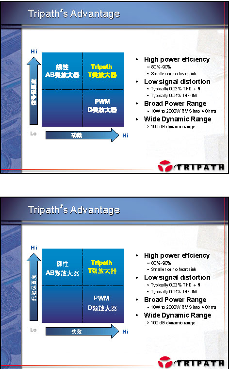 硅谷的芯片设计和制造商通常不直接参与整机制造业的竞争,他们在为整机厂家提供优质服务的过程中,不断掌握市场对现有芯片功能的改进要求,从而不断完善产品系列的定义、开发和服务。 重视产品的规划(plan)和市场策略,也给我深刻印象。例如视频数据流处理将是未来多媒体处理器的关键技术。Trimedia公司只出售核心IP,它规划市场,让芯片设计商和整机制造商去冲锋陷阵。 在硅谷,公司之间存在人才、技术和市场的全方位竞争,但是我感觉他们通常用技术手段来将自己的产品与竞争对手的产品区分开来,有些产品也存在交叉。因此,为了保护自己的技术和市场利益,IP创新和专利技术保护就成为安身立命的根本。 每一个新想法,都有可能创造出一个专利或IP。在这里,总裁或CEO带上好的思路(idea)辞职创办新公司的现象很普遍。除了业已形成的尊重知识产权的风气和制度之外,良好的风险投资体系、风险退出机制、丰富的人才资源、完善的配套服务系统等等,都为新公司的诞生提供了充足的养分。 本文试图介绍我所访问的十几家公司在集成电路技术方面的最新进展和发展趋势。 DPP技术使功率放大器获得80%以上效率 放大器的功效和信号的保真度如图1所示,线性AB类放大器的失真最小,但是功效最低;D类放大器的功效最高,但是失真最大,并且用D类放大器制造的音频产品体积和功耗很大,为了解决散热问题,需要安装巨大的散热装置。能否获得一种失真小、功效大的放大器呢? Tripath公司将数字信号处理技术、混合信号处理技术、封装技术和功率集成电路技术融合,提出了数字功率处理技术DPP(Digital Power Processing)。该技术的基本框图如图2所示。它由自适应信号处理器、数字变换功能、静音控制、过载处理、故障检测、预测处理和量化逻辑功能电路等组成。 输入信号经过处理之后,获得振幅、频率等信息,然后确定输出开关信号的占空比,占空比与D类放大器不同,它在600kHz-1.5MHz之间变化,平均为600到700kHz,因而类似于扩谱工作方式。 传统的功率放大器对模拟信号直接放大,因而很难解决效率低、失真大、散热装置庞大等等一系列问题。新技术的突破在于: