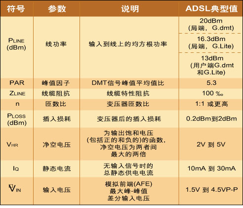 在现有的电话双绞线的基础上实现高带宽的因特网接入的特点使ADSL应用大受欢迎。随着数字信号处理技术的发展,ADSL的应用日益普及,设计的关键也开始转移到模拟部分,本文将从局端ADSL驱动电路的各种参数设计以及功耗的优化、变压器的设计等方面进行探讨,并说明实用电路的设计。 ADSL技术在现有的双绞线实现512KHz到8MHz的数据传输速率,相对传统的调制解调器而言接入速率有很大提高。国际电联(ITU)将ADSL的传输规范分为全速(Full-Rate),即G.dmt和低数据率的G.Lite。这两个系统都采用离散多音(DMT)的技术传输数据。该技术将1.2MHz的带宽分割成256个独立的子载波,子载波通道宽度为4.3125KHz,每个子载波各自传送数据,像256个调制解调器并行地工作。为了进一步增加数据速率,每个子载波都采用正交幅度调制(QAM)。 在实际的应用中,子载波通道的分配与数据传输方向和电话线环路的长度有关。绝大多数的通道用作从局端到用户端的数据传送,即下传通道,该方向数据量最大,而上传数据主要是实现向服务器的请求,数据量小;而电话环路越短,功率要求越低,反之功率要求越高,而且使用到的通道数将降低,每通道的数码率也将降低。由于传输数据速率的大小将会影响到电路电压的选择、功率和散热等,认识到这些对于局端和用户端的接收、驱动设备的设计很有意义。 驱动电路设计的几个要点 a.驱动放大器的基本参数设计 以下为驱动放大器的参数设计(相关参数见表1),这些参数值与具体的放大器无关。 设定电话线功率为PLINE, 单位为W,均方根(RMS)线电压为: 变压器的的初级功率为: 变压器初级阻抗为: 初级均方根电压为: 变压器初级均方根电流为: 放大器输出均方根驱动电压为: 这个电压是两个放大器输出之间的均方根电压,选择两个适当的RBT值,这个电压值可达到变压器初级均方根电压的两倍。 驱动放大器峰值输出电流为: 实现该峰值电流的能力是选择驱动放大器的重要指标。 放大器的输出功率为: 驱动放大器的总电压增益为: 差值放大器增益为: 变压器的匝数比在本设计中很关键:图1中所示为驱动器总供电电压和峰值输出电流与匝数比的函数关系。图中所示的电压为在假定放大器净空电压(Headroom Voltage)为0的理想放大器以及变压器插入损耗为0的理想变压器条件下的理想供电电压。在实际应用中,电源电压必须高于这个电压值。 b. 驱动电路的特性参数:净空电压和静态电流 在计算供电电压、功率和热耗散大小时,必须考虑净空电压和静态电流的大小。放大器的最低供电电压为: 实际的放大器的供电电压必须高于该电压值以避免在信号峰值时对信号的削减,而电压也不能过高,电压过高会加大放大器的功率耗散。 放大器的净空电压决定于输出电压要求,也可能决定于输出饱和电压对输出电流或对不同负载电流的温度曲线。(净空电压为在给定负载电流下供电电压和最大输出电压的差值,包括正、负电压部分。) 图1所示为决定放大器输出饱和电压的一个简单模型以及数据曲线示例。 c. 优化功率损耗,调整静态电流和关断电流 在本文中所用的几款放大器静态电流都可外部设定。对于不同的DSL电路设计调整放大器的工作点可以最小化功率损耗,使失真最小化。但最小失真与功率损耗有矛盾关系,需要均衡考虑。静态电流减小,功率损耗也将降低,但由于要使失真最小化必须为内部放大器电路提供偏置电流,所以静态电流降低将恶化失真特性。图2所示为LT1795工作电流的调整方法,通过一个外部电阻来设定内部电流源,通过该内部电流源的电流经过放大作为两个放大器的偏置电流,图2中示意了调整工作电流对失真的影响。工作电流太低,信号将会严重失真,并且不可避免地会与其它通道之间产生干扰。应该在实际的运行条件下调整该电流使电路优化。 系统设计的功率和热管理的最有效办法是在无信号时关断驱动电路。数字电路可以检测到无信号传输状态,在无信号时控制电路向驱动部分发送一个数字信号,关断驱动电路。很多的放大器具有该控制信号接口,能将内部电路电源全部关断。例如,LT1796在没有数据发送时可以处于关断状态,消耗的电流仅200uA。当要求电路启动时,电路必须在几个毫秒内完全恢复到正常工作状态。在关断条件下放大器进入高阻状态。