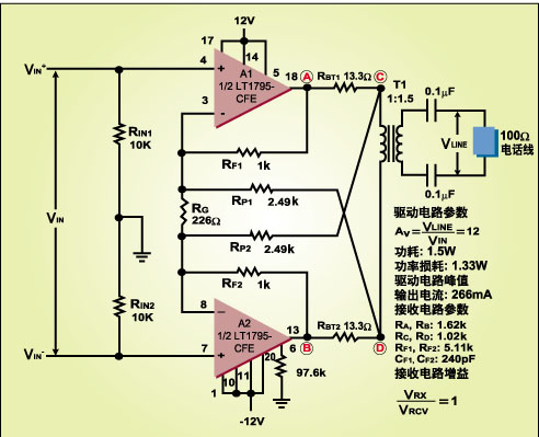 图2示意了放大器降低功耗功能,该功能也称为部分关断,放大器保持很小的偏置电流,该电流使调制解调器能继续监控线上的信号。在电路中用两个电阻控制静态电流的大小,使电路在关断状态下保持很小的维持电流。实现的具体办法可以将DSP的一个I/O引脚通过一个电阻接到放大器的控制脚上,由DSP提供一个控制电平。驱动电路关断的办法可以使功耗减小到正常运行时的十分之一。 d. 电源的去耦合设计 与很多电路设计一样,电源的噪声去耦合设计很关键。在电路板上所有接电源的引脚处分别接入一个大、小旁路电容,可以减小电源中很宽频率范围的噪声和纹波电压。建议在驱动和接收电路的电源输入引脚上接入高频去耦合电容,在放大器的两个电源输入(正负电源端)引脚间直接接入一个10uF的电容,可以减小电源线上纹波的二次谐波分量。 e. 变压器的设计 变压器的选择。电路中变压器用于电话线和驱动/接收电路之间的耦合以及实现电话线与驱动/接收电路的隔离,要求变压器的频率响应范围为20kHz到2MHz,插入损耗低。变压器的初次级线圈的匝数比会影响到放大器对电源电压的要求,如果通过变压器实现信号电压的提升,则不需要放大器的电压变化。理想的变压器的输入输出功率是相等的,因此如果输出电压升高则输出电流将减小,相反电流将增高。采用升压变压器可以降低对输入端运算放大器工作电压的要求,这样可以采用一些常用电源,当然放大器必须具有足够的电流驱动能力。另外,由于变压器同时用作接收线上的信号,变压器的匝数比的选择还决定于接收电路的灵敏度。初、次级匝数比越高,接收到的信号电压越低。 变压器终端电阻阻值的确定。为了实现阻抗匹配和检测输入信号,在变压器初级和放大器的输出端之间接入两个电阻,即RBT。该电阻的阻值是变压器匝数比与电话线阻抗大小的函数关系,设次级线圈(即与电话线相连的一端)与初级线圈的匝数比为n,电话线阻抗为ZLINE,为实现电话线阻抗与调制解调器的阻抗匹配,变压器初级的总电阻(RPRIMARY )必须满足以下关系式: 为了对变压器的初级均衡驱动,每个放大器要均衡负担部分负载,电阻RBT设定为变压器初级电阻的一半,即 ADSL G.Lite驱动电路设计 图3所示为ADSL G.Lite线驱动电路,该电路的功耗低于1W。采用±12V供电,变压器的初次级匝数比为1:1.2。该电路使用放大器LT1795CFE,采用TSSOP封装,适合于局端设备中在单板上集成多个接口驱动电路。 低功耗的ADSL G.dmt驱动电路 图4所示为低功耗的局端G.dmt线驱动电路,该电路可实现8Mbps传输流驱动,具有效率高的特点。 该电路采用匝数比为1.5:1的变压器,使电流大大降低,功耗可降低300mW左右。为实现这种效果一般需要采用±14V的电压和22.2欧姆的RBT电阻,该电路采用的电阻为13.3欧姆,仍然可得到变压器的初级阻抗为100欧姆,实现阻抗匹配,但这种设计对上传信号的接收不利,造成电阻RBT两端的信号电平低。该电路设计适合于采用灵敏模拟前端接收的系统。 该设计中采用RP电阻实现从一个放大器的输出信号产生正反馈信号到另一个放大器的输入。借助于这个反馈作用,尽管RBT电阻从22.2欧姆减小到 13.3欧姆,但从节点C和D看进去的电阻为100欧姆,仍然实现阻抗的匹配。该电阻还可以减小,但相应地接收信号将减小。设定一个因子K,电阻RBT可以用下式表示: 如果变压器匝数比设定为1:1.5,RBT的值应为22.2欧姆,在图4的设计中该电阻值为13.3欧姆,所以K=0.6。信号从正向通道到输出的信号增益设为G,则 正反馈信号的增益设定为P,则 为达到正常的阻抗匹配,应满足以下关系:P=1-K 为得到从模拟前端(AFE)到线输出的适当电压增益AV,G设定为: VPRI为初级电压,VLINE为线电压。计算驱动电路的增益还需要考虑到变压器的匝数比和插入损耗。 本电路中采用正反馈修正闭环增益,不会对电路性能产生任何影响,可以大大降低电路的功耗。由于前面所述的因素,本电路仅适合对接收信号电平要求不高的系统中。 将电路中的Rp1和Rp2省去,将RG改为133欧姆,RBT1,RBT2改为12.4欧姆,变压器的匝数比改为2:1,该电路也可实现G.dmt线驱动功能,而且RBT两端的信号电平将恢复正常,但电路的峰值输出电流将达到335mA,其中一半的功耗消耗在电阻(RBT)上。可以减小该电阻降低功耗,但是同时也改变了输出阻抗,不能与电话线阻抗匹配,也减小了接收信号的电平值。 本文总结 ADSL局端驱动电路设计过程复杂,要全面考虑电压、电流、功耗、干扰以及变压器和放大电路等器件的设计,由于在局端常常需要在单板上集成很多接口驱动电路,在设计时如何减小电路的功率耗散也很重要。只有完全考虑多方面的因素才能实现一个完美的设计 |