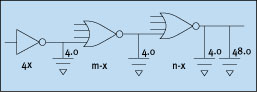 在典型的综合和布局布线(SPR)流程中,通常使用静态库单元实现设计。在静态库中,单元的个数以及能实现优化的程度是有限的。这种方法的效率比完全用户定制设计更低。过去,由于SPR工具不能有效地在晶体管级实现自动化设计,因而静态库的这种局限性是不可避免的。其结果是无法在EDA设计流程中自动生成单元,而绝大多数需要手工实现。 随着第三方库设计公司的出现,现在的单元库常常采用外购的形式。 如果可以在设计流程中生成库,就能避免固定库元件的局限性,使性能提高10%到15%,面积减小25%,功耗降低25%甚至更多,面市时间也将因减少了设计的反复次数而缩短。这种方案适用于任何电路或逻辑类型。 尽管静态的标准单元库通常有很多逻辑功能,但是对于任何一个特定的逻辑功能,可用的晶体管种类数是有限的。在常见的有300个单元的库中,每一逻辑功能-如四输入的或门可以有一到十种不同的电特性。但是,晶体管体积却可能有成千上万种变化,产生的时序特性也各不相同。例如,对于给定的逻辑功能,改变β比值(P型晶体管和N型晶体管的宽度之比),就可以改变单元的驱动能力。如果一个单元由多级逻辑组成,还可以通过改变级间驱动力(drive strength)的比值来改变单元的特性。这样,每个逻辑单元的电特性可以有上千种可能的有用变化。 在选择晶体管的最佳体积时,应根据单元所处的电路状况来确定,包括单元的负载和前级的驱动力。较大的晶体管驱动负载的能力较大,但是加重了前级电路的负载,功耗也较大。如果可用的元件数有限,则不能实现全面的优化设计,设计周期、功耗、面积都会增加。 降低功耗的几种途径 静态CMOS模块的功耗可以用CV2f来近似表示,其中C为该模块的总电容,V为电压,f为设计频率。假定电压和频率在给定的设计中是固定的,则功耗与总电容大小成正比。影响功耗的还有其它因素,如在开关动作期间电源对地的短路等。但是,只要减小晶体管总宽度和互连电容,这些因素的影响将随之减小。 如果不受固定元件库的限制,任意设定晶体管体积可以在以下几个方面优化设计: 1. 减小关键路径的延时,提高性能;2. 避免了因为没有合适的库元件而使时序路径超出预算,不得不手工修改的情况,提高了时序/设计的收敛性。3. 减少设计中晶体管的总体积,降低功耗;4. 通过减小晶体管的总体积可使面积减小,也减小了互连电容,进而降低功耗。 图1所示为标准单元模块的时序路径。假设图中反相器的初始驱动力固定为触发器的输出驱动能力的4倍(表示为4x),同时假设被驱动门的输入电容为48个单位(以1x反向器的输入电容为一个单位)。 假设P型晶体管的驱动能力为N型晶体管的一半,而四输入或非门的上升沿和下降沿时间相同,则其输入电容是具有相同驱动力的反相器的三倍。在这里互连电容成为增大延时和功耗的重要因素,假设每一连线的电容为4。设定两个门的驱动力为m和n,用下式可计算通过路径的延时: T = (3.0 × m + 4) / 4 + (3.0 × n + 4) / m + (48 + 4)/ n 例如,当第一个门是8x或非门,第二个门是16x或非门,总的延时为: T = (3.0 × 8 + 4) / 4 + (3.0 × 16 + 4) / 8 + 52 / 16 = 7.0 + 6.5 + 3.25 = 16.75 C = 4.0 + 3.0 × m + 4.0 + 3.0 × n 功耗与总电容量成正比,以1x反相器的功耗为单位。 门的驱动力越大,延时越小,但前级延时却随之增加。在一般的库中,每一单元有多种驱动力。假设驱动力的典型值为:1x、2x、4x、8x等。这样的库的最佳时序方案为: m = 8x,n = 16x 该方案产生的延时为16.75,功耗为80.0。 在目标周期时间为16.75的条件下,上面的方案尽管驱动力逐级减小,而且第二个或非门的功耗很高,但是在使用固定库元件的条件下这是唯一能满足时序要求的方案。 产生派生单元的好处之一是提高时序和设计的收敛性。下面考虑在标准单元库中仅有1x的四输入或非门的情况。在这种情况下,m=1x、n=1x(唯一的可行情况),产生的延时为60.75,几乎是要求周期的四倍。很明显,这种方案不可行,必须重新进行设计。 虽然插入缓冲器有时可以缓解这种矛盾,但是缓冲器会产生额外的延时,使时序仍然无法达到要求。在库中添加由较小驱动力门电路加缓冲器组成的较高驱动力的门,同样于事无补。实际上,它与插入缓冲器的效果是一样的,反而不能单独改变各级的驱动能力。很多标准单元库中普遍存在缺少单级、高驱动能力的一些不常用门器件的问题。 自动生成派生单元可解决这一问题,更容易实现设计的收敛性。在这种情况下允许任意设定库元件的体积,因此可以根据下列条件下获得最佳延时: m = 7.0x,n = 11.0x 在该条件下产生16.3个单位的时延,功耗为62.0个单位。 任意确定晶体管体积可以使晶体管体积减小30%、功耗降低22%(包括互连电容对减小功耗的贡献),而面积可减小30%。但是,如果目标周期为16.75,而且已经在设计的其它部分固定下来,在上例中减小路径的延时并没有什么好处。 如果选用周期为16.75,还可以进一步降低功耗。最佳方案为: m = 5.3x,n = 8.1x 产生的延时为16.73,功耗为48.2,功耗降低高达40%。而且,晶体管体积减小了44%,视标准单元库的版图形式和布线密集度的不同,面积最多可减小44%。这将减小布线引起的电容,进一步降低功耗。 对于设计中时序并不关键的路径,甚至可以将功耗减小更多。例如,如果周期是16.9,而不是16.75,可以采用以下方案优化功耗: m = 5.0x, n = 7.8x 这一方案的功耗为46.