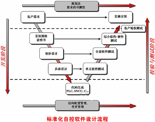 二、仿真校验测试 目前国际上已经普遍采用的是在现场之前校验测试自控系统的设计,从而节省大量的现场工作时间和劳动。国内则刚好相反,全面软件测试和综合软件测试全部需要到现场去做。在现场边安装边调试成为国内所有系统集成商的唯一选择。大多数工程都必须花费数个月的现场时间,不仅严重影响用户的产品上市时间,对于系统集成商本身也是巨大人力和物力的浪费。 今天,长时间的现场调试已经变得不可容忍!最终用户给予系统集成商的时间越来越短,并且对工程延误处以高额罚金。这就迫使自控系统集成商在现场调试之前对自控代码设计进行校验测试,发现并更正绝大多数设计错误,从而确保使用最短的现场时间完成系统的安装调试。 很显然,通过仿真方法建立现场对象的形式化模型,然后在此仿真环境中对自控软件进行校验和验证是最自然的解决方案。当然,这样的仿真校验必须是在完整的仿真环境下(仿真整个生产线甚至是整个工厂环境)进行,而各硬件厂商自带的仿真工具由于只能仿真测试单个功能块,是无法担此重任的,需要使用一些先进的自控软件设计CASE(计算机辅助软件工程)工具,如ControlBuild等。 通过仿真进行校验测试具有无可比拟的优点: 1、在仿真环境下校验测试自控软件,发现并更正绝大多数的设计错误,大大缩短现场安装调试时间。从国外的经验来看,通过仿真校验可以将数个月的现场安装调试时间缩短到数个星期,极大地提高了效率。 2、在仿真环境下,改变环境及生产条件,测试设计的反应 3、在仿真环境下,可以引入各种异常,失灵情况,对设计进行破坏性测试 4、在仿真环境下,虚拟机器100%可使用 5、在仿真环境下,有更多的时间去测试和修改 6、仿真环境提供了更好的工作环境,避免进入一些高危险性的场合(高温、酸、易爆、有毒等) 7、在物理设备或系统没有实际安装或联接的情况下,可以提早校验测试、提早投产 8、系统操作员和维护人员可以提早接受培训,提高操作维护水平。 仿真校验在欧美自控界已被广泛使用。更由于仿真校验对最终用户的巨大好处(几乎没有坏处)而受到最终用户的强烈推崇。许多公司甚至硬性规定必须使用仿真校验。例如,PSA标志雪铁龙集团就强迫要求所有自控系统集成商,在现场安装之前必须使用仿真对设计进行校验测试,确保生产线按时高质量完工。事实上,来自最终用户的强力推动正是仿真校验在欧美迅速推广起来的重要原因之一。然而令人惊讶的是,这样的先进理念在国内却无声无息,我们迟迟看不到这方面的介绍和探讨。而最终用户更是在不知情的情况下被迫接受效率极其低下的现场调试,并且对频繁的工程延误和预算超标束手无策。当然我们相信这样的状况不会持久。随着国外自控系统集成商和工程公司的逐步进入,先进的自控设计理念也必然随之进入中国。仿真校验作为一股不可阻挡的潮流,在国内自控界的流行将指日可待。 三、CASE工具篇 在上篇介绍文章中我们介绍了国际自动软件设计领域中仿真校验的趋势,接下来我们来谈谈CASE这个概念。CASE 是英文 Computer Aided Software Engineering的缩写,主要是指利用一整套的方法和工具对系统规则进行建模,并自动生成合适的程序。CASE概念在IT界已经流行多年,现在已经是必不可少的常用手段。而在自控软件设计领域,CASE概念的流行还是最近几年的事情,但发展速度之迅速却是出乎许多人的预料。由于CASE概念为自控软件设计领域带来脱胎换骨般的变化,使整个领域提升至一个全新的高度,在短短一两年的时间内就迅速在欧美自控界普及开来。令人遗憾的是在国内自控界却几乎无人谈及,也很少有这方面的介绍文章。 CASE概念在自控软件设计领域中的应用主要还是围绕着标准V型设计流程来展开。在设计的各个阶段,尽量多的使用计算机手段帮助设计人员高质量地完成设计,并尽可能地减少需要使用的不同工具或产品种类,减少不同工具之间的数据重新捕获,提高设计复用性,减轻设计人员掌握不同工具所需的学习量,降低整个设计和运营成本。下面,我们就根据V型图的设计流程,逐一介绍一下CASE概念在自控软件设计领域中的应用。 1、设计规格说明书:可执行的规格说明书(形式化设计) 自控软件设计的第一步是根据用户需求完成设计规格说明书。设计说明书是后面所有工作的基础,它的好坏直接影响到整个设计的好坏。目前国内普遍使用基于文本的工具编写(如Word、Excel等)。但是,由于文本语言自身的特点,对于相同的文本每个人的理解经常会出现差异,基于文本的设计说明书不可避免地在用户和设计人员之间造成歧义和误解。这些错误往往要到设计的最后阶段甚至到现场安装阶段才被发现,造成巨大浪费并付出重大代价。因此,如何在设计的最初始阶段解决所有的歧义,充分和用户沟通并确保设计规格说明书完全符合用户需求就显得极为重要。 目前国际上的做法是在文本说明书的基础上,全面使用“可执行”的说明书。所谓“可执行”,是指在设计的最开始阶段,设计人员通过对用户需求的分析,对系统进行高层设计,使用用户熟悉的图形化方法对系统进行分解和形式化建模。这就把基于文本的设计规格说明书可视化,同时清晰准确地和客户沟通。对现场对象的形式化建模能够清除在用户需求清单中含糊不清的条款,降低在项
