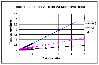 Beta的绝对值不重要,也不造成测量误差。重要的是在工艺变化或工作条件变化时,beta不是一个恒定值。Beta随温度变化,但更重要的是,它将作为晶体管中集电极电流的结果而变化。Beta改变测量电流的比率,并因而像理想因子值η一样加大偏移。 如方程式8中所示(见附录),如果β2 = β1 = β,那么分母中自然对数的每两项等于1,方程式8变成方程式5。同样地,随着β增加,beta失配的作用越来越小。在许多分立式晶体管器件中,beta为50-100的数量级,然而在衬底PNP器件中,beta的大小常常小于1,甚至低至0.25。 如图5中所示,仅为1的beta变化将引起0.75度的误差。在很小几何尺寸的器件中,在所用电流范围beta变化可高达35%。