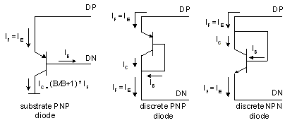 噪声注入更难以用绝对值进行量化。VBE测量通常在特定的频率进行,并通过一个低通滤波器。二极管噪声注入的大部分被衰减,然而,由于低通滤波器并不理想,噪声残余会产生DC偏移。由于A/D转换器对VBE测量的DC值进行取样,通过通常模式的注入,一些噪声无法去除,因而在温度测量中产生偏移。噪声误差的大小由注入的噪声以及测量电路的滤波能力所决定。 最后一个误差源是由于大多数测量二极管在实际中是晶体管或VBE结而引入的。在二极管中,IF值设置为正向电压VF。当使用连接至晶体管或衬底VBE结的二极管时,被驱动流入二极管的电流,和被设为一个确切比率的电流,为发射极电流,尽管集电极电流决定VBE电压。发射极电流和集电极电流之间的关系已知,并且这里beta会有影响。图4显示了连接晶体管作为热二极管的几种常见配置。