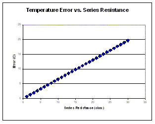 很多热传感二极管包括连接到离散晶体管(如2N3904)的二极管,或衬底晶体管的基极-发射结。采用晶体管代替二极管的工作基本原理仍然适用,而上述二极管方程式适用于以VBE(或者对于PNP型器件是VEB)代替VF,以及以IC代替IF的晶体管。 对于一级操作,方程式5(见附录)显示了所测量的对探险测温度的关系。由方程式4(见附录)可见,温度1℃的变化相应于VF约244μV的变化。这一很小的值通常被做乘法,然而通过模数转换器(A/D转换器)进行测量,然后采用数个通信协议发射至微控制器。 在对这么小的电压的测量中的任何误差,都会给最终测量的温度造成很大影响。有4个主要误差源将影响ΔVBE数值,并最终影响报告的温度。误差源为串连阻抗、二极管方程式的理想值(η)、噪声注入和晶体管的非理想beta值。 串连阻抗直接影响ΔVBE的测量,增加了由用于测量温度的绝对电流差所决定的偏移量。如果不忽略该串连阻抗,方程式5变成方程式6(见附录)。 如方程式6所示,串连阻抗产生根据串连阻抗值而变化的温度读数的偏移。图2显示了相对于该串连阻抗的单一温度的温度误差。