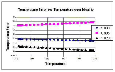 理想因子值η是一个基于晶体管结构的物理特性。对于任何特定器件而言,该值是一常数,虽然对于不同器件有所变化。当理想因子值不等于1.000或不等于温度监视器配置的理想因子时,它就会造成误差。在方程式5中,温度测量反比与该值,如果它不同于理想值(或预期值),它将产生一个与温度不一致的乘法放大值。 下面图3显示了由于各种理想因子失配而引入的有效误差。