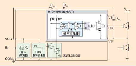 驱动器IC 由于成本效益的原因,HVIC和LVIC设计为具有最少的必要功能,特别适合于消费电器的逆变器驱动。设计方面的考虑包括:借助精细工艺技术减小芯片尺寸;由3V馈入微控制器直接驱动有效的“高电平”接口;低功耗;更高的抗噪声能力;抗温度变化的更好稳定性等等。 HVIC的一个特性是内置高电平偏移功能,如图3所示,能够将来自微控制器的PWM输入直接转换至高边功率器件。此外,使用外部充电反向电容,可以采用单一控制电源驱动SPM。