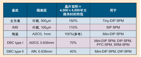 封装 开发SPM封装的主要因素是改善性价比,同时提升热循环和功率循环等封装的可靠性。因此,以往用于IC和LSI产品的转模封装技术被用于功率模块。与具有塑料或环氧树脂外壳的普通功率模块相比,SPM具有相对简单的结构:功率芯片和IC安装在铜引线框架上,基底材料与框架连接,最后在环氧树脂中模塑成型。 在封装设计中散热是重要的问题,因为它决定了模块的功率容量限制,且与隔离特性有着很大的折衷平衡关系。转模封装SPM系列根据功率额定值和应用,采用几种隔离基底,如表2所示。