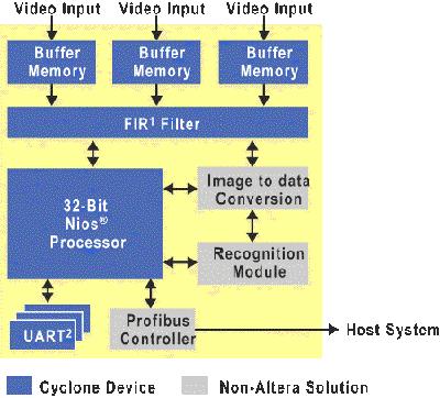 工厂自动化系统控制制造和工业环境中的生产流程。这些自动化系统不断从生产线的传感器上(一般是电荷耦合数码相机)接收数据并将之过滤,接着通过工业系统厂商的专用图像识别算法对数据进行处理。 图像识别模块让自动化系统可以识别生产流程中的各种状态,比如产品的缺失或者缺陷。该信息接着被传输到主系统,主系统参考该信息来加速或减慢生产线,或启动对生产线上某个部件的拒收程序。 FPGA可用来在一般的工厂自动化系统中执行各种不同的任务。Nios嵌入式处理器可作为组件控制器,减轻主控制器执行系统任务的负担。 FPGA可借助IP内核来执行10/100 Ethernet MAC和CAN,从而进一步加快设计时间。图2展示了FPGA的RAM区块中执行的缓冲功能,以及FPGA为开发一个完整的工厂自动化方案而利用IP内核来执行的FIR滤波器和UART功能。 设计者可以利用IP内核结合一个嵌入式处理器来加快设计速度,从而将更多精力集中于系统设计的其它方面。另外,各种离散器件的功能被集成到一个FPGA中,减少了板上的离散元件数量,压缩了设计成本和时间,从而极大地降低了成本。