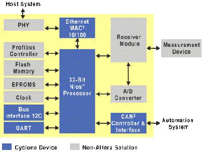 工业系统一般都以升级的设计方案为基础,这些设计方案在大都采用ASIC或者ASSP,有时也需要依靠更传统的电子设备如微控制器或微处理器、离散数字和模拟设备以及内存芯片等。但每一次无论是推出新品还是对产品进行升级,一旦需要新的特征、功能或者改进,设计人员都必须从零做起。 ASIC和ASSP设计方法为工业产品设计提供了固定平台,但是其成本昂贵,开发时间长,而且很难实现产品差异化。如果使用传统的离散器件,在目前整个工程设计领域都在呼吁更大的设计灵活性、产品差异化和更低设计成本的情况下,显然不具备任何设计优势。 ASIC、ASSP和传统的芯片式设计无法满足新一代工业系统的需求。新的工业应用需要可灵活定制的硬件和软件平台、性能更高的数字信号处理(DSP)、更短的产品开发周期、更低的设计成本和更快的上市速度。 FPGA曾被归类到胶合逻辑,但目前具备了高端和高集成功能,能提供很多设计上的优势。 基于FPGA的可编程平台给工业系统设计者们提供了快速低成本产品创新和进化的基础。FPGA的灵活性带来了一个独特方法,让设计者可以创建一个硬件设计方案作为多种不同产品的基础,从而降低设计和制造成本。这一点是完全可能的,因为使用FPGA的可编程平台让他们可以通过设计重编程来快速开发新的特征或功能。 设计者们还能以最小的工程量来设计新功能或者进行设计升级,以面对不断改变的市场需求和标准。另外,即便是已在工厂车间使用的工业产品,都能借助FPGA进行升级。 另外,这样的一个平台设计策略可以实现更大的产品差异化,并可能提高利润。它让工业系统能携新特征更快上市,同时又在用户面前保住了品牌,并进一步降低了某个产品设计被废弃的风险。 产品废弃会给工业系统OEM产生极高的硬件成本,有时甚至高达数百万美元。据估计工业系统OEM平均要花费15%-20%的工程时间来重新设计系统的功能并更新文件。 FPGA就能帮助OEM减轻这一沉重负担。FPGA设备可以完美适用于各种工业应用领域,包括安保系统、工业自动化、控制系统、现场测量、开关和控制装置、环境和楼宇控制、马达控制等。无论是在性能还是在价格方面,它们都能够满足这些以及其它成本敏感型工业应用的要求。FPGA能集成各种工业现场总线标准,例如Profinet, Sercos III, Cip Synch, Ethernet-PowerLink, Ethernet IP和EtherCat等,这充分显示出它给设计者带来的非凡的灵活性。这些不同的标准原本需要大量不同的适配卡,每张卡都专用于某个标准。而且生产这些适配卡要耗费很大的工作量,并需要很多离散元件。 在这种情况下,就可以使用一个FPGA设备来集成各种不同的现场总线标准,从而不需要开发如此多的适配卡,自然也就节省了成本。它只需要物理接收器来使电器特征和专用现场总线相匹配。 FPGA可以在系统生产的过程中进行编程,为某个特定的现场总线提供量身定做的电子设备。另外,FPGA也可以通过现场重编程来轻松执行某个标准的新规范。FPGA还能用于过程控制和工厂自动化。在这些工业设计中,FPGA结合IP内核,可以降低开发成本、提高设计灵活性并缩短开发周期。 像Cyclone II等FPGA,都带有一个32位的Nios II嵌入式处理器,能给工业设计者带来高效和灵活性,以添加应用外围设备并实现所需的内核性能。设计者可以对成本和性能作出权衡,既可以设计一个低端低成本的从系统,也可以设计一个处理器内核与速度及所需外围设备完美匹配的高端高性能的系统。 过程控制系统对制造环境进行监控,并依据用户设定的限制对过程和制造流程进行控制。典型的过程控制系统都会使用一个像激光二极管这样的测量装置来检测工业环境中的气体或者液体成分。某种气体或液体的频率信号频率信号被发送到接收器,接收器将之转化成数字信号,接着由处理器进行鉴定。下一步,主控制器和自动化系统会利用该鉴定信息来执行系统任务。如图1,FPGA中的嵌入式处理器控制系统,而能匹配IP内核的FPGA则执行Ethernet媒体访问控制(MAC)功能、一个控制控制器局域网(CAN)的控制器接口、UART和内部集成电路总线控制器接口。