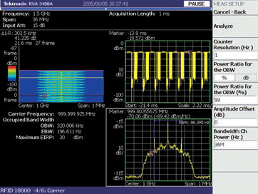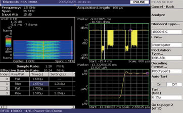 标准一致性 阅读器和标签之间可靠的相互作用要求与 ISO 18000-6 C 类型规范等产业标准相一致。该要求增加了许多超出基本要求的测试以满足政府的频谱发射要求。RF 一致性测试十分关键,有助于确保标签和阅读器间的可靠协同工作。 预编程测量能减少进行这些测试所需的建立时间。例如,ISO18000-6 C 类型的一个重要测量是启动时间和关闭时间。载波能量上升时间必须足够快以保证标签采集到使其正常工作的充足能量。信号也必须迅速达到稳定状态。发射结束时,载波能量下降时间必须足够快,以防止其他发射受到干扰 [参阅图3]。