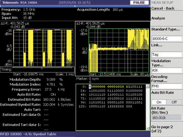 随着阅读器与标签价格的降低和全球市场的扩大,射频标识RFID(以下简称RFID)的应用与日俱增。标签既可由阅读器供电(无源标签),也可以由标签的板上电源供电(半有源标签和有源标签)。由于亚微型无源CMOS标签的成本降低,库存和其他应用迅速增加。一些评估表明,随着无源标签的价格持续下降,几乎每一个售出产品的内部都将有一个RFID标签。由于无源RFID标签的重要性及其独特的工程实现的挑战性,本文将重点研究无源标签系统。 当接收到来自阅读器的CW信号时,无源标签对射频 RF(以下简称 RF)能量进行整流以生成保持标签工作所需的小部分能量,然后改变其天线的吸收特点以调制信号,并通过反向散射反射给阅读器 [参阅图1]。RFID系统通常使用简便的调制技术和编码体制。然而,简单调制技术的频谱效率低,对于某一给定的数据速率,它所要求的RF带宽多。在调制前,必须将数据进行编码形成一连续的信息流。可用的位编码体制有很多类型,每一类编码都有其基带频谱性能的独特优势、编解码的复杂性以及在时钟驱动下将数据写入到存储器的困难性。由于标签板上定时源很难达到实际所需的准确性,以及挑战性的带宽要求和最大化RF能量传输以向标签供应能量等原因,无源标签对所使用的编码体制有独特的要求。最后,需要某种防冲突协议以便阅读器能够读取其覆盖范围内的所有标签。 RFID测试综述 每一个RFID通信系统都必须通过监管要求并符合所用标准。然而,今天,系统优化将这个快速增长产业中的胜者与输者分离开来。本文讨论的是 RFID 通信系统的设计师所面对的测试挑战:监管测试、标准一致性和优化。 RFID技术有几个不同寻常的工程测试挑战,例如瞬时信号、带宽效率低的调制技术和反向散射数据。传统的扫频调谐频谱分析仪、矢量信号分析仪和示波器已被用于无线数据链路的开发。然而,这些工具用于RFID测试时都存在一些缺点。扫频调谐频谱分析仪难以准确捕获和刻画瞬时 RF 信号。矢量信号分析仪实际上不支持频谱效率低的RFID调制技术及特殊解码要求。快速示波器的测量动态范围小,不具备调制和解码功能。实时频谱分析仪 RTSA(以下简称 RTSA)克服了这些传统测试工具的局限性,具备对瞬时信号的优化,通过泰克享有专利的频率模板触发器能够可靠触发复杂的真实频谱环境下的特定频谱事件。 监管测试 每个电子设备制造商都必须符合设备销售地或使用地的监管标准。许多国家正在修改监管法规以紧跟无源 RFID 标签的独特数据链路特点。大多数监管部门禁止设备的 CW 发射,除非用于短期测试。无源标签要求阅读器发送 CW 信号以向标签供应能量并经过反向散射实现调制。即使无源标签没有一个典型的发射器,仍能发出一个被调制的信号。然而,许多规定并没有涉及基于无发射器的调制。多种频谱发射测试并没有明确地包含在阅读器的 RFID 标准中,但却成为了规定。 政府规定要求控制发射信号的功率、频率、带宽。这些规定防止有害干扰并保证每个发射者都是频带内其他用户的友好邻居。对于许多频谱分析仪特别是通常用于脉冲信号能量测量的扫频频谱分析仪,进行此类测量是具有挑战性的。RTSA 能够分析一个完整的分组发射过程的能量特点,也能直接测量跳频信号的载波频率,而无需将信号置于一个跨度的中心。按一下按键,分析仪就能识别一个瞬时 RFID 信号的调制方式并能够对功率、频率和带宽进行监管测量,使预一致性(pre-compliance)测试过程变得非常灵活和方便 [参阅图2]。预一致性测试有助于确保产品一次通过一致性测试,而无需重新设计和重新测试。