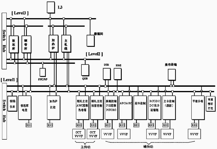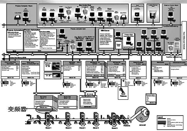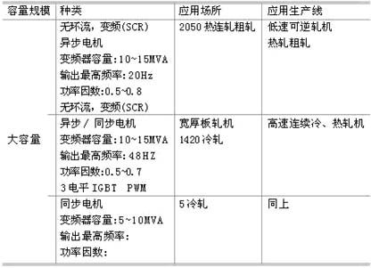 | 引言 1 变频器在宝钢的应用历程 (1)宝钢在一期建设(1985年9月以前):宝钢设备的电气传动大多是采用直流电机调速装置。特别是主轧线全部采用大容量直流电机传动。 (2)二期建设(1985年9月~1991年10月):设备的电气传动少量采用交流变频调速技术,且为模拟量控制。例如2050热轧R3机架采用同步电机,变频器为模拟量控制。 (3) 三期及以后的建设中(1993年以后至今):大量采用交流变频调速技术,且为全数字化控制。 随着电子技术和交流变频调速技术的迅猛发展,原直流电机存在的换向和换向器、电刷等部件维护工作量较大等问题,使其在提高单机大容量、过载能力和降低转动惯量以及简化维护等方面受到了限制,不能满足轧钢机向大型化、高速化方面的发展,新建的热轧,冷轧,炼钢,连铸,高炉等几乎100%采用全交流化传动。 2 变频器在自动化系统中的作用 从自动化角度看,过程控制系统分为: 设备级(简称L0) 基础自动化级(简称L1); 过程控制级(简称L2); 上级管理计算机(简称L3)。 过程控制级(简称L2),其主要功能是根据接收上级管理计算机(简称L3)下传的生产计划及工艺要求进行模型计算和优化设定计算;基础自动化级(简称L1)其主要功能是实施优化控制和顺序控制及对生产实绩进行收集;设备级(简称L0)按下传的指令对设备进行直接控制,完成按工艺要求对材料的加工。由于交流变频器(L0)的全数字化,通过现场总线连接,强化了L0与L1的信息集成,便于调试和维护,因而L0(马达控制)已成为自动化控制系统中重要组成部分。 3 变频器在宝钢的应用 交流变频器在宝钢具有大量而广泛的应用,变频器的供电装置、变频器及马达三者已成为宝钢生产厂设备的心脏,其应用包括热轧粗轧机、精轧机、飞剪、卷取机、平整机、立辊、活套及辅助生产线;冷轧包括冷连轧;各种处理线及辅助生产线;炼钢包括倾动,氧副枪等;连铸包括大包旋转、结晶器调宽、引锭杆,还有高速线材,钢管,宽厚板等生产线都大量采用变频调速技术。宝钢主生产线上的变频装置随主合同一起引进,由于主线上变频装置属于高电压、大电流、大容量变频装置,技术复杂性高,设备庞大,在选择方案时要十分慎重,主要采用三菱/东芝(TMEIC)、西门子、ABB、安川、富士、施耐德、罗克韦尔等世界著名电气厂商的产品。 马达控制方式及轧机对变频器的要求 1 马达控制方式 马达是根据变频器产生驱动的,变频器的控制方式大致可分为三类:速度控制、电流控制和电压控制。 (1) 速度控制(简称ASR) ![]() 图1 马达控制方式 速度控制框图如图1(a)所示,适用于速度控制精度要求高的场合。 图1(a)中: Ref:从PLC向变频器传递的速度指令(Reference); Fbk:马达的直接速度检测器(PLG)信号向变频器反馈(Feedback)。 (2) 电流控制(简称ACR) 电流控制如图1(b)所示。一般用于要求电流恒定的负载。如活套张力控制,卷取机咬钢时带钢的控制。 图1(b)中: C.Ref.:从PLC向变频器传输的电流指令; SLC-Ref.:从PLC向变频器传输的速度极限值; SLC-Fbk:马达将速度检测(PLG)的信号向变频器反馈; SLC:速度极限控制。 (3) 电压控制(简称AVR) 电压控制如图1(c)所示,即变频器输出电压/频率的协调控制=V/F控制,一般用于对速度控制精度要求不高的场合。 图1(c)中: Ref.:从PLC向变频器传输的频率指令(Reference)。 2 轧机对变频器的要求 变频器是将工频交流电源变成对马达可控的变频交流电源,向马达供电,实现马达将电能转换成机械能,宝钢生产对变频器的总要求如图2所示。具体来说,应满足: ![]() 图2 对变频器的要求 (1) 适应电网要求,变频器注入电网的电流谐波和功率因数要满足电网要求; (2) 满足工艺要求(马达),即满足轧钢工艺对轧制功率、转矩、转速、调速范围; (3) 满足传动系统指标要求; (4) 满足信息化要求,即满足与自动化系统硬软件接口的要求; (5) 经济性。 3 轧机工艺对电气传动控制性的要求 轧机对电气传动控制性的要求如下: (1)中厚板热连轧机:粗轧机属于低速,大容量可逆轧机,要求大转矩大过载能力,电机功率5~12MW,转速在50r/min左右,过载2.5倍以上,但对速度精度和动态响应要求不高; (2)热连轧机:精轧机传动功率大,电机功率5~10MW,但转速不高于600r/min,电机单方向连续运行,过载1.5倍,要求传动系统具有0.1%的速度和高于30rad/s的动态响应; (3)冷连轧机:轧机功率2~6MW,对传动系统的性能指标要求最高,速度精度0.01%,动态响应达到60rad/s。冷轧加工线传动的功率不大,一般小于2MVA,但系统性能指标要求同冷连轧。 4 轧机工艺对通讯的要求 过程控制现场设备(马达)与控制器(PLC)之间信息互访要求,以及对网络通信通用性的要求,促进了各个相互兼容适用的标准、串行、开放、双向的多站数字实时通信系统的发展,产生了现场总线标准。从本质上说,现场总线是一种实时控制网络。现场总线连接自动化最底层的现场控制器和现场智能设备,网线上传输的主要是检测信息、状态信息、控制信息等,传输信息量小,但要求可靠性高,实时性强。 变频器在宝钢的应用 1 TIMEIC/三菱电机/东芝的变频器在宝钢的应用情况 TIMEIC/三菱电机/东芝的变频器在宝钢的应用情况,如表1所示。 表1 TIMEC/三菱电机/东芝变频器在宝钢应用 ![]() 2 西门子变频器在宝钢的应用情况 西门子变频器在宝钢的应用情况,如表2所示。 表2 西门子变频器在宝钢应用 ![]() 3 变频器在宝钢热轧的应用 ![]() 图3 变频器在热轧的应