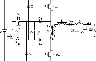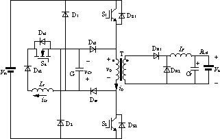 | 0 引言 随着电力电子技术的不断发展,高频电源 target=_blank>开关电源的应用越来越广泛。 提高功率器件的开关频率,可改善装置的输入输出特性,减小体积和重量,所以高频功率变换器受到人们的青睐。但开关频率的提高也带来了不利的影响,通常器件在脉宽调制(PWM)硬开关工作方式下,开关损耗正比于开关频率[1]。当开关频率提高时,开关损耗增加,导致散热器体积和重量增大,效率降低。尤其当功率器件在高电压、大电流场合下作高频运行时,开关损耗会变得相当严重,同时也带来严重的电磁干扰。为了解决高频运行时开关损耗和电磁干扰的问题,目前有准谐振电路、零开关脉宽调制(PWM)电路、零转换脉宽调制(PWM)电路等几种软开关电路[2]。准谐振电路和零开关脉宽调制(PWM)电路的谐振环节是串联在主电路中,使得功率器件的电压、电流应力较大。零转换脉宽调制(PWM)电路的谐振环节与主开关管并联,因此输入电压和输出电流对电路谐振过程的影响小,电路在很宽的输入电压和输出电流范围内都可实现软开关,大大降低了电路中无功功率的交换,提高了效率。本文介绍了一种双管正激式零电压转换-脉宽调制(ZVT-PWM)功率变换器,并将其应用于航空蓄电池充电器。 1 电路的工作原理 1.1 电路的拓扑结构 双管正激ZVT-PWM功率变换器拓扑结构如图1所示。 ![]() 图1 双管正激ZVT-PWM功率变换器拓扑 图1中,S1(DS1)、S2(DS2)、D1、D2、变压器T及变压器副边的整流和滤波电路构成双管正激变换器,变压器原副边匝比为n=N1/N2。辅助开关管Sa(Da1)、辅助二极管Da2、Da3和Da4、谐振电感Lr和谐振电容Cr构成辅助电路,以实现主开关管的软开关。 1.2 电路的工作原理[3] 电路主要波形如图2所示。在t0时刻之前,主开关管S1、S2和辅助开关管Sa均处于关断状态,谐振电感电流为零,谐振电容电压为-Vin,负载电流Io流过续流二极管DR2。 ![]() 图2 电路主要波形 (1)模态1[t0,t1]在t0时刻开通辅助开关管Sa,Lr和Cr开始谐振工作,在ta时刻,谐振电感电流达到最大值,谐振电容电压下降为零。在t1时刻谐振电感电流为零,谐振电容电压为Vin,主开关管S1、S2两端电压下降到零。 (2)模态2[t1,t2]在t1时刻零电压开通S1、S2,加在变压器原边绕组上的电压为电源电压Vin,整流管DR1导通,DR2关断,原边开始为负载供电,在t2时刻关断S1、S2。 (3)模态3[t2,t3]在t2时刻关断S1、S2后,整流管DR2继续导通,负载电流和励磁电流通过Da3和Da4同时给谐振电容Cr充电,由于Cr限制了S1、S2上的电压上升率,S1、S2是零电压关断。在t3时刻,Cr的电压下降到零。 (4)模态4[t3,t4]励磁电感与谐振电容Cr谐振工作,整流管DR1关断,负载电流流过续流二极管DR2,在t4时刻,谐振电容电压下降到-Vin。 (5)模态5[t4,t5]当谐振电容电压下降到-Vin后,二极管D1、D2导通,将谐振电容电压箝在-Vin,在t5时刻,励磁电流减小到零,变压器完成磁复位。 (6)模态6[t5,t6]负载电流流过续流二极管DR2,在t6时刻,Sa开通,开始另一个周期。 2 软开关的实现 2.1 软开关范围 充电器在工作时,输入电压是一定的,但是负载电流不是一个定值,在轻载时,副边折算到原边的电流太小,那么变压器原边所积聚的能量就不足以使得功率开关管S1、S2工作在软开关条件下。航空182酸性蓄电池常规两阶段充电第一阶段充电电流为18A,转换以后第二阶段充电电流为9A。电源电流输出范围是4~20A,那么设计充电电源在10A时,功率开关管S1、S2开始工作在软开关。 2.2 软开关实现策略 通过变压器铁芯加气隙,减小激磁电感,增大激磁电流,可以实现S1、S2的软开通,但是变压器铁芯加气隙的代价是增大了电源的通态损耗。S1、S2实现了软开通,可以减小其开通损耗,减小其发热量,改善电源工作性能,加大了电源工作的可靠性,是值得的。 另一种方法是在副边整流二极管DR1支路上串联一个饱和电感,延缓整流二极管DR1开通时刻,即饱和电感暂时将变压器和负载断开,整个激磁电流将全部用来对谐振电容Cr充电,但是在高频时,此饱和电感损耗较大。 2.3 寄生振荡对电路的影响及其克服办法 由电路工作原理中开关模态2原理分析中得知,由于辅助二极管Da2的阻断作用,当iLr下降到零后不能反向流动,在t1时刻后可以零电压关断辅助开关Sa。然而在实验中发现,Lr与Da2的结电容Ca2以及Sa漏源结电容CSa产生了严重的寄生振荡。在高电压、大功率情况下,功率二极管的结电容较大,从而使这一振荡的幅度也较大。振荡必然带来电路噪声,影响系统稳定性,因此必须加以克服。解决这个问题的办法是在谐振电感支路中串联一饱和电感来吸收该振荡。当其上通过正向电流时,饱和电感很快进入饱和状态,相当于短路而不起作用,当其上电流逐渐减小到零时,呈现一个很大的感抗,瞬间相当于断开了该支路。 改进的双管正激零电压转换-脉宽调制(ZVT-PWM)功率变换器拓扑结构如图3所示。 ![]() 图3 改进的双管正激ZVT-PWM功率变换器拓扑结构 3 充电控制技术 充电控制方式是根据航空铅蓄电池充电标准的两阶段恒流充电法。在第一阶段充电电流为蓄电池容量的10%,第二阶段充电电流为蓄电池容量的5%。在充电过程中,随着蓄电池电动势的升高,逐渐提高充电电压,以保持充电电流的恒定,当充电电压上升到蓄电池额定电压的1.15~1.2倍时,蓄电池开始析气,此时将充电电流降为第二阶段电流,直到蓄电池充电。原理框图如图4所示。同时在充电过程中采用dv/dt技术,即判断蓄电池的端电压在
