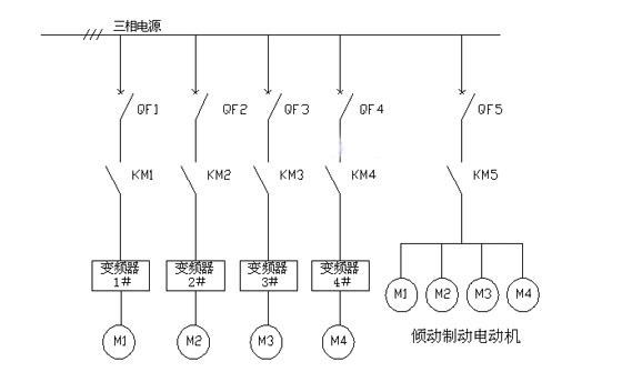 4 变频器在转炉倾动装置控制系统的应用情况 4.1 变频器的选择 根据转炉倾动装置这种负载特性,选用变频器的最重要的原则是变频器必须具有在满载或过载时输出恒定转矩的功能。这是因为转炉倾动装置具有大的惯性及四象限运行的负载特性。在实际过程中,随转炉倾动角度的变化及炉内所装钢水的流动造成其负载特性发生变化。此时电动机可能处于再生发电制动状态,所要求具有再生发电制动功能。冷钢70t转炉倾动装置选用的是瑞典ABB公司生产的ACS800系列变频器及相应的制动斩波器与制动单元系统。其主回路如图2所示:
