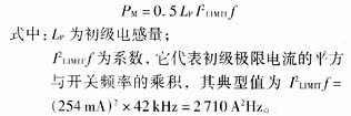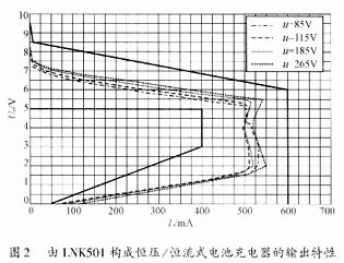该恒压/恒流式电池充电器的输出特性如图2所示。图2中的实线代表极限值。次级整流管VD2采用11DQ06型1A/60V肖特基二极管,亦可用MBR160代替。 3电路设计要点 3.1最大输出功率 LinkSwitch在交流85~265V宽范围输入、交流230V固定输入时的最大连续输出功率(POM)分别为3W、4W。为达到最大连续输出功率,设计电路时应注意以下事项。 1)设计的直流输入电压最小值UImin≥90V。当交流输入电压u=85~265V时,输入滤波电容的容量可按3μF/W的比例系数来选取。对于交流230V或115V固定输入电压,可按1μF/W的比例系数来选取。 2)LinkSwitch是专门设计在不连续模式下工作的,此时初级绕组感应电压UOR的范围是40~60V。若设计成连续模式,会导致环路工作不稳定。 3)次级整流管应采用肖特基二极管。图1中的VD2就采用1A/60V的肖特基二极管。 4)预先可假定电源效率η=70%。 5)源极引脚必须与印制板上的覆铜箔接触良好,以保证将热量及时散发出去,使芯片温度不超过+100℃。 除了受温度条件、通风状况、封装形式、电源结构等因素的影响之外,在给定条件下LinkSwitch的最大输出功率还与高频变压器磁芯的大小、导磁率、初级电感容量、最小输入电压、输入滤波电容的容量、输出电压、整流管压降等参数有关,这会造成实际的POM值与设计值不相等。 3.2高频变压器 在非连续模式下,当功率MOSFET关断时,已存储在高频变压器中的能量就转换为次级输出。若不考虑次级损耗的情况下,则高频变压器的最大转换功率为  PM所对应的控制端电流用IDCT来表示,IDCT可用来设定LinkSwitch电源的最大输出功率点POM。 当开关电源从恒流区开始工作时,初级电感量(LP)对峰值输出功率(POPK)起决定作用,该参数应加以控制。若估计的POPK值允许有±20%的变化量,则LP值允许偏差±10%,磁芯的气隙δ≥0.08mm。 若采用EE13型磁芯,取δ=0.08mm,LP允许有±10%的偏差,初级感应电压UOR=40~60V,则LinkSwitch的最大输出功率可达2.7W。选择尺寸较大的磁芯能提升感应电压UOR,进而提高输出功率。例如,选择EE16型磁芯时,最大输出功率为3W。如不考虑空载时的功率损耗,还可采用EE19型磁芯,在交流230V输入时,UOR>70V,将输出功率提高到5W。UOR还影响恒流输出特性曲线的线性度。在完成设计前应检查恒流输出特性。 3.3影响输出特性的因素 LinkSwitch输出特性的余量由LinkSwitch的余量以及外部电路来决定。采用如图1所示电路时,最大输出功率为2.75W,输出电压的变化量为±10%,输出电流的变化量为±20%。影响输出特性的因素主要有初级漏感、次级整流管的压降和输出引线上的电阻。例如,当初级漏感达到50μH时将导致空载时的输出电压大约上升30%。如果增加光耦反馈电路并利用外部稳压管进行二次稳压,那么整个负载范围内的输出电压变化量可降低到±5%。 3.4关键元器件的选择 下面以图1为例,介绍选择外围关键元器件的原则。 1)钳位二极管VD1应选择耐压为600V甚至更高的快恢复或超快恢复二极管,不能用普通的低速二极管。 2)钳位电容C4可采用0.1μF、100V的金属膜或塑料薄膜电容,容量误差在±5%、±10%或±20%均可,但不推荐使用陶瓷电容,因为该种电容受温度和电压变化的影响较大、容易引起输出电压的波动。 3)控制端电容C3可为LinkSwitch的上电过程或自动重启动阶段提供控制电压。设计电池充电器时,C3应选择0.22μF、10V的电容器,以保证有足够的时间去启动电路。 4)选择反馈电阻R1的原则是在最大输出功率时能使2.3mA的反馈电流流入控制端。R1的准确值还要看所设计的UOR值。适当增大R1值可改变电池充电器的输出特性,如图3所示。