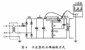 图3中的虚线框代表典型的输出特性曲线,实线框表示增大R1值以后的实际工作区,虚线箭头分别表示恒压区及恒流区的变化方向。由图3  5)如需要增加安全电容滤除次级上的瞬态干扰,应将安全电容并联在初级电路返回端与次级电路返回端之间。安全电容的容量很小,但耐压值必须达到1.5kV才符合IEC标准。 3.5示波器的接线方式 在用示波器观察LinkSwitch的输出波形时,如果将探针接源极S,地线接初级的返回端,那么探头分布电容上的电荷可能造成误触发,使LinkSwitch达到极限电流。正确的方法是按图4所示,将探头的地线接LinkSwitch的漏极D,以直流作为参考点。由于漏极上有直流高压,因此,在电源的进线端必须接隔离变压器T1。
