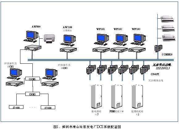 1、概述 在当今世界上,环境与发展问题已经成为全球普遍关注的焦点问题。环境保护已成为可持续发展进程的一个重要组成部分。在我国,随着经济的持续高速增长,人民生活水平迅速提高,城市化进程也在不断加快。但同时也面临着日趋严重的环境问题,特别是垃圾的处理。利用垃圾焚化炉所产生的热来发电,是垃圾处理的重要方向。发达国家普遍采用垃圾发电形式来处理垃圾。我国的垃圾发电技术的发展还刚刚起步,基本上是成套引进国外技术,成本极高。为了满足国内垃圾处理迫切的需求和广阔的市场,实现垃圾焚烧技术的国产化势在必行。本文结合深圳市南山垃圾发电厂的工程应用实例,简单介绍了炉排垃圾焚烧炉这一垃圾焚烧炉的特点。同时对采用美国FOXBORO公司IA系统实现的DCS系统的设计和工程应用作了简单介绍。深圳市南山垃圾发电厂的成功投运为实现垃圾焚烧技术的国产化积累了经验。