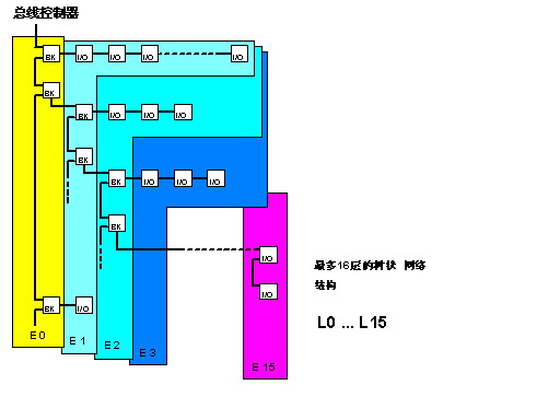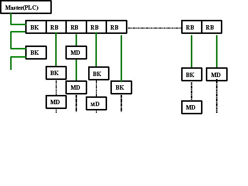 图中: MASTER——主站,PLC或是INTERBUS控制卡。 BK——INTERBUS耦合器,即一个网络节点,也叫从站。 RB——扩展在耦合器后面的分支模块。本例中扩展了10块。 MD——马达启动器。 现场一共有十个滚床输送段,做成2层网络,第2层网络有10个分支。设计者在主控柜中的第一个从站的耦合器(BK)之后就扩展了10个分支模块(RB),每个RB后面再通过INTERBUS总线连接“BK”或马达启动器,上例中每个滚床配置一台马达启动器用来驱动滚床电机,所有驱动控制信号通过INTERBUS总线传输,MD上带有数字量输入接口,现场的传感器通过MD传到PLC。用来驱动各自工艺段的电机和收集输入信号。网络结构非常清楚,每段分支,每个设备都可以单独的关断单独调试。这样的结构,对设备的调试和管理而言,无疑是最方便的。
