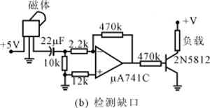 | 霍尔传感元器件是精密的电子元件,下面通过应用实例进一步了解他。这些例子仅是该类应用中的一种,用同样的原理和方法,使用者可根据自己的使用需要,设计出自己的应用装置。 1、检测磁场 用霍尔线性器件作探头,测量10-6T~10T的交变和恒定磁场,已有许多商品仪器。这里,仅介绍一种用经过校准的UGN3503或A3515型霍尔线性电路来检测磁场的磁感应强度的简便方法。电路出厂时,工厂可提供每块电路的校准曲线和灵敏度系数。测量时,将电路第一脚(面对标志面从左到右数)接电源,第二脚接地,第三脚接高输入阻抗(>10kΩ)电压表,通电后,将电路放入被测磁场中,让磁力线垂直于电路表面,读出电压表的数值,即可从校准曲线上查得相应的磁感应强度值。使用前,将器件通电一分钟,使之达到稳定。 用灵敏度系数计算被测磁场的B值时,可用 B=[Vout(B)-Vout(o)]1000/S 式中,Vout(B)=加上被测磁场时的电压读数,单位为V,Vout(o)=未加被测磁场时的电压读数,单位为V,S=灵敏度系数,单位为mV/G(高斯),B=被测磁场的磁感应强度,单位为G。 2 、 检测铁磁物体 在霍尔线性电路背面偏置一个永磁体,如图11所示。图11(a)表示检测铁磁物体的缺口,图11(b)表示检测齿轮的齿。它们的电路接法见图12,(a)为检测齿轮,(b)为检测缺口。用这种方法可以检测齿轮的转速。 ![]() 图11 用霍尔线性电路检测铁磁物体 ![]() 图12 用霍尔线性电路检测齿口的线路 3、 用在直流无刷电机中 直流无刷电机使用永磁转子,在定子的适当位置放置所需数量的霍尔器件,它们的输出和相应的定子绕组的供电电路相连。当转子经过霍尔器件附近时,永磁转子的磁场令已通电的霍尔器件输出一个电压使定子绕组供电电路导通,给相应的定子绕组供电,产生和转子磁场极性相同的磁场,推斥转子继续转动。到下一位置,前一位置的霍尔器件停止工作,下位的霍尔器件导通,使下一绕组通电,产生推斥场使转子继续转动。如此循环,维持电机的工作。其工作原理示于图13。 在这里,霍尔器件起位置传感器的作用,检测转子磁极的位置,它的输出使定子绕组供电电路通断,又起开关作用,当转子磁极离去时,令上一个霍尔器件停止工作,下一个器件开始工作,使转子磁极总是面对推斥磁场,霍尔器件又起定子电流的换向作用。 无刷电机中的霍尔器件,既可使用霍尔元件,也可使用霍尔开关电路。使用霍尔元件时,一般要外接放大电路,如图14所示,使用霍尔开关电路,可直接驱动电机绕组,使线路大为简化,如图15所示。 ![]() 图13 霍尔元件在无刷电机中的工作(其中的HG为霍尔元件) ![]() 图14 采用霍尔元件的电机驱动电路(图中的H为霍尔元件) ![]() 图15 用CS2018霍尔开关锁定电路直接驱动电机的线路示意图(图中的线圈为电机定子绕组) |