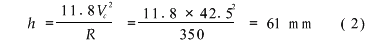 12号道岔的最大允许通过速度为50km/h,当列车以此速度侧向通过道岔时,欠超高大于《地铁设计规范》规定的61mm,因此,在不影响通过能力的前提下,宜对列车侧向通过道岔的运行速度加以限制。当列车以42 5km/h的速度侧向通过12号道岔时,曲线轨道超高为: