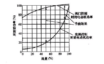 图二 一种型号水泵的流量——负载曲线 上面的一条曲线是阀门控制时电动机功率和流量的关系,下面一条是调速控制时的电动机功率和流量的关系,在同一流量的垂直线上两条曲线的差值就是可以节能的数量,从两条曲线明显可以看出,在流量接近100%也就是接近满载时,采用调速控制并不能节能,甚至有可能还因为调速设备的用电而多耗能;而当流量在满载的90%以下时明显可以节能,流量越小节能越明显。