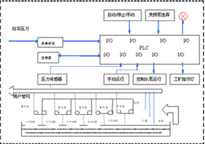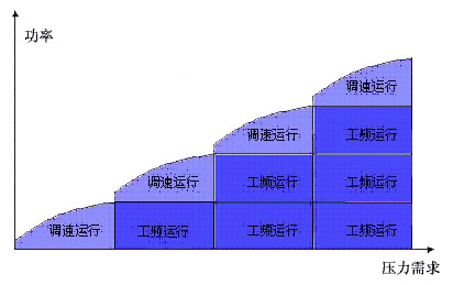 三、变频控制柜一拖多应用特征 在水泵多机应用中,传统控制压力或液位的方法是将多台水泵全部运行,并通过调节阀、档板之类来调节,最终达到压力或液位的控制要求。由于所有的水泵都是全速运行,耗电严重且控制频繁,尤其是在加一台太多、减一台太少的情况下。因此,对于多台水泵使用一拖多变频控制是非常理想的。具体示意图如下。