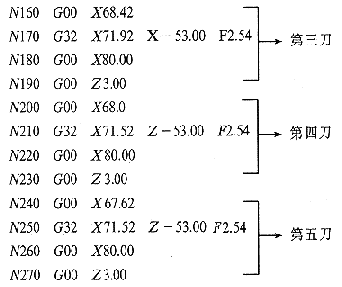 3 对油管扣加工进行分析、计算 我们从零件图1中可知,这是一个两头对称的27/8TBG油管螺纹,固其加工工艺分为在普通车床上加工外圆、内孔至尺寸,1:16外锥留适量余量;然后在数控车床上用油管螺纹梳刀分六次车削油管螺纹。用2齿梳刀车削27/8TBG螺纹的切削图形。 4 编制加工程序 27/8TBG油管螺纹分六刀车削完毕,其中每一刀的程序编制除尺寸有所变化外,其它基本一样,也可编成一个车螺纹的子程序。其循环过程为: