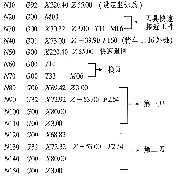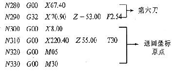 5 结论 用普通管螺纹车床加工油管螺纹不易达到油管螺纹的技术要求,即使是能保证加工精度,调整机床也费时费力。用数控车床加工油管螺纹,靠程序可达到技术要求,同时也可保证加工零件的一致性,减轻工人劳动强度,提高生产率和经济效益。