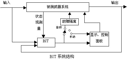 (f) 通电BIT——启动BIT的一种特定形式,当系统或设备通电时便执行检测。 而其中可以划分出两种主要结构类型:一种是以被动连续BIT为主要运行形式的BIT系统,另外一种是以主动、启动BIT为主要运行形式的BIT系统。 自动连续BIT系统的基本结构,它可在武器系统飞行或航行过程中自动运行,不断监控出现的信号、数值和逻辑,给出系统状态信息和故障信息,根据系统设置,采取自动或手动隔离故障,启动备份设备等措施。 启动BIT必须由驾驶员或地面维修人员在地面维修时启动,在测试期间使系统工作中断,地面的测试设备和激励信号要加到被测系统中,模拟仿真武器系统在实际飞行或航行过程中姿态控制,从而验证出系统的可靠性和故障指标等参数。