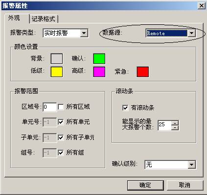 图形对象的使用: 在紫金桥中,某些图形对象可以直接通过数据源访问远程数据,如报警、总貌、趋势等图形单元,可以直接指定数据源以访问远程数据源。下面以实时报警为例,示例如何使用远程数据源。