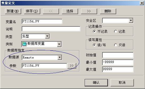 数据访问是分布式数据库的基本应用。我们知道,在DRAW中对数据库的访问通过变量对数据库进行访问,该类变量就是数据库变量。 注意:数据库指定部分,数据源指定为要访问的数据源Remote,参数指定为其在Remote数据库中的点参数名称PT1154.PV。 提示:如果有两个数据库的变量同名,如上例中在本地数据库中已经存在一个变量PT1154.PV,而且需要同时访问这两个变量,则在定义变量时,把其中的任何一个定义为其它名称,如把Remote的PT1154.PV定义为RPT1154.PV即可。 此时,就可以在DRAW中引用该变量了。可以对其进行显示,赋值,进行运算等一切操作。如我们在DRAW中画一个文本对象,组态其模拟输入/输出动作都为PT1154.PV,则运行后,在该画面上可以看到其显示的数值与远程数据库的一致。而且,在VIEW上修改数据可以同时在服务器的数据库上同步显示其修改后的值。