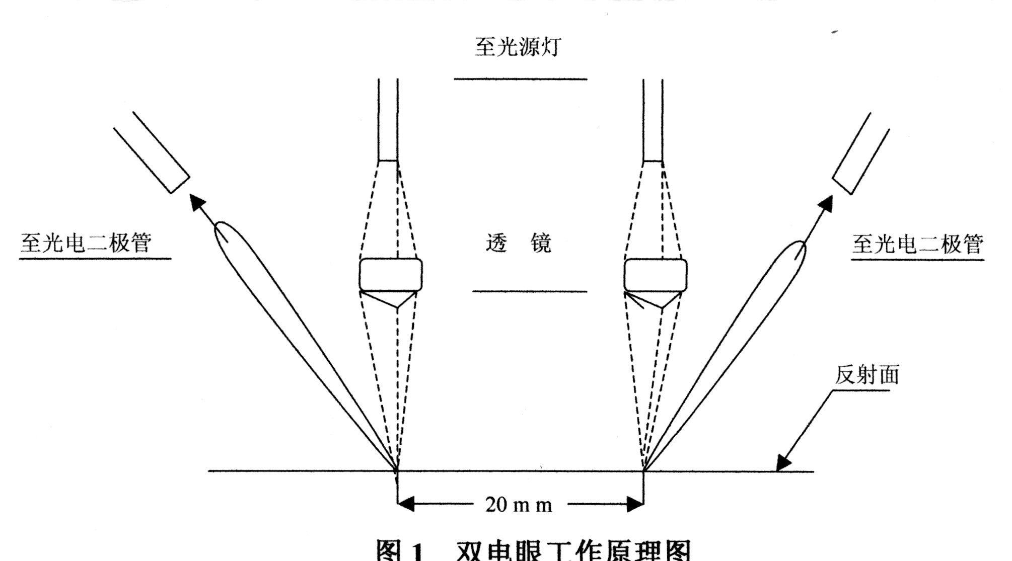 凹印机双电眼检测、快速套印技术的控制原理及应用 佛山市飞友自动化技术有限公司 刘 飞 时代在发展,社会在进步。随着社会信息化及经济全球化的发展,凹版印刷技术也发生了巨大地变化。目前,由于计算机技术和光纤传感及其他现代科学技术在凹印机上得到广泛应用,使凹印机的智能化自动控制技术更加完善,印刷速度和印刷精度愈来愈高,高档彩色凹印机印刷速度已达200-300m/min,套准精度为±0.1mm。高速化、自动化、优质化已成为高档凹印设备的主要发展方向。许多新技术的采用,使高档凹印机越来越多的受到市场青睐。如:电子轴传动技术(无轴传动技术)、无套色补偿辊双电眼检测自动套印技术、250米/分高速运行状态下“零速”接纸技术、高精度预对版及对版误差快速修正技术以及大卷径收卷自动换料技术等等。未来几年,我国凹印设备制造业将面临新的发展机遇和挑战。 一、双电眼检测的工作原理和优特点 凹印机在印刷彩色图像时,是将彩色图像分成若干单色图像,并按一定的颜色顺序分别制版。在印刷过程中,再将各单色图像重叠,组合成精美的彩色图像。例如,首先印刷第一种颜色,通过干燥箱使之充分干燥,然后再印刷第二种颜色。这样,由于物料通过很多根导辊和干燥箱,承印材料会引起伸长或收缩;另外,由于各印刷单元不可能完全同步以及各版辊间张力变化等等因素都会使承印物料产生微妙的变化。假如这些变化是一定的话,那么就不会发生套色偏差问题。但是,由于上述各种各样的变化因素,使套色偏差不可避免。这种套色偏差在性质上是连续变化的,且偏差量也不一定,因此必须要不断地、准确地监视和采样,并及时加以修正,才能较好地保证高档次彩印产品质量的稳定性,彩印图案才不会产生套印“跑版”。 那么,我们如何能准确而及时的监视和采集到印刷过程中的套色偏差呢?方法是在承印物的左侧空白区,印刷上各色的套色标志(即色标):线宽为0.8-1mm,线长为10mm的短横直线,与承印物料前进方向呈纵向排列。各色标中心间距严格规格定为20mm。如果没有套色偏差,各色标均保持间距20mm不变;如果间距变为19.5mm或20.5mm,则套色偏差为±0.5mm。双光电眼和编码器就是用来监视和检测这些色标的。它被安装在第2色以后(含第2色)的各印刷单元的调节支座上,垂直对准承印物料的色标,并调节好电眼与承印物的焦距。在承印物的后面还设置有一块反光板(约离承印物1mm处)。 现将双光电眼的作用原理示于图1中。它是由一个光源、两个透镜、两个光电二极管所组成。因此,在反射面上聚集有两个焦点,两个焦点中心距正好为20mm。在这两个焦点面上各套色标志通过时,两个光电二极管分别接收两个焦点的反射光,反射光的变化由双电眼记录下来,并转换成相应的电流。随后这种电流的变化被送入到中央控制器,并称为脉冲。如果,两个脉冲在双电眼中的两个光电二极管同时发生时套色偏差为零。在时间上不管哪一方先发生均作为套色偏差而存在。这个时间愈短,套色偏差量就越小。