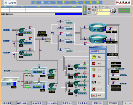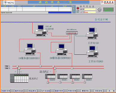 | 摘要:本文介绍的是InTouch在某醋酸纤维有限公司《动力工段自控系统改造》项目中的应用。 关键词:intouch 1. 系统简介 《动力工段自控系统改造》项目是对南纤公司原有动力工段的自控系统进行改造和优化。目标是充分利用原有软硬件资源,用最少的投入获得高效、安全的系统性能。 原动力工段包括:化水车间、冷冻空压车间(简称动力车间)、软水站及一二泵房车间,各自拥有自己的控制室。改造前,化水车间已采用了一套SIEMENS TI545 PLC 和两台全点的INTOUCH 操作站实现监控,泵房车间也已采用了一套SIEMENS TI545 PLC 和两台256 点的INTOUCH 操作站实现监控,动力车间除5 台压缩空气干燥器采用GE 90-30PLC 控制外其余设备的监控均用盘装仪表实现。原动力工段系统结构如下图所示。 改造前的系统结构 系统改造后,泵房车间和动力车间由原泵房车间的SIEMENS TI545 PLC 控制(需增加一些卡件),化水车间在原系统基础上增加一些功能。将原有的两台全点INTOUCH 和一台256 点INTOUCH 移入新设的集中控制室,实现三个车间的集中监控,在化水车间设一台256 点INTOUCH 操作站,供现场巡回检查时使用。 同时系统通过一台新设的数据及Web 服务器与公司管理网连接,公司和工段管理者可通过公司区域网获取生产过程的数据和报表。 改造后的系统结构 2. 系统功能及特点 2.1冗余的总线及操作站 系统包含2 台全点的INTOUCH(SERVER1、SERVER2)和2 台256 点的INTOUCH(CLIENT1、CLIENT2),SERVER1、SERVER2 分别通过各自的TIWAY 卡与化水、泵房的PLC 构成两条冗余的TIWAY 总线。CLIENT1、CLIENT2 则通过远程变量访问某台全点INTOUCH 上的数据从而实现对现场的监控。通常CLIENT1、CLIENT2只与SERVER1、SERVE2 中的一台通讯,当发生通讯故障时会自动尝试与另一台SERVER 连接。INTOUCH 中的“通讯状态”画面显示了各工作站、PLC 及总线的当前状态。 ![]() 图中红线表示操作站在线,黑色表示离线。在CLIENT1、CLIENT2 的“通讯状态”画面中,工程师可以手动切换CLIENT 与SERVER 的连接。 2.2“瘦”操作站模式 256 点的CLIENT 通过远程变量访问全点的SERVER 从而访问PLC,这样CLIENT的变量配置不超过256点。同时系统运用了“分布式报警”和“分布式历史趋势”等功能,所有的报警记录及历史趋势都存储在全点的SERVER上,CLIENT上显示的报警和历史趋势是从SERVER上获得的。可以说,SERVER充当了INTOUCH服务器而CLIENT是一个INTOUCH 客户端,只需较低的配置即可。当切换SERVER时,“分布式报警”和“分布式历史趋势”也跟着自动切换。 1.“分布式报警”的设置 在INTOUCH 组态中需用“分布式报警”控件,在控件的报警查询栏中输入“\\SERVER1\INTOUCH!DONGLI”,SERVER1 为缺省连接的计算机名,DONGLI 表示INTOUCH 中的DONGLI 报警组(报警组包括DONGLI、HS)。在SERVER 的计算机属性需选中“本机将提供报警”;而在CLIENT 的计算机属性中需选中“本机将显示报警”。运行时CLIENT 将通过函数切换与SERVER 的连接。 为了统一报警设置,我们将报警做在PLC 的报警模块中通过对PLC 变量“AHA(报警上限)、AHHA(报警上上限)、ALA(报警下限)、ALLA(报警下下限)、APV(报警过程值)、AVF(报警状态字)”的读写来判断和设置报警。有报警发生时,只有SERVER 会将报警信息写入报警记录,SERVER2 在写报警信息前先判断SERVER1是否在运行,以免重复写入。 2.“分布式历史趋势”的设置(以SERVER1 为例) 在SERVER 的INTOUCH 组态中需将历史数据的存放路径设为INTOUCH 默认路径。CLIENT 的INTOUCH 组态需在“分布式名称管理器”中的“分布式历史”里添加一项,供应器名称为“SERVER1”,路径为“\\SERVER1\D\NCFC2000S1”(工程路径)即可。在CLIENT 中访问SERVER1 的历史数据需写成“SERVER1.TAGNAME”。SERVER2 的设置与SERVER1 相同。 3.远程变量的引用 在CLIENT 上使用远程变量只需在变量名前加计算机 名即可,无需在标记名字典中新建变量,所以不占点数。(SERVER:TAGNAME) 4.自动切换功能 CLIENT 通过远程变量观察SERVER 上的$Second 变量,若它在在一段时间内无变化则表明与SERVER 的连接出现问题,这时可通过SetAccessName 函数将CLIENT 上的远程变量切换到另一台SERVER 上。 2.3公用的操作窗口 系统中对于具有相同操作接口设备使用了公用的操作窗口,而不是对应每个设备都创建一个操作窗口,这样大大减少了窗口的数量。实现它需要用到间接变量,可以将间接变量看作一个指针,当对某个设备操作时,利用间接变量指向操作变量,这样,对间接变量的赋值就会作用到操作变量上,操作变量的变化也会反应到间接变量上。 以过滤水泵为例,在过滤水处理系统中,点击3#过滤泵,弹出操作窗口,如下图所示: 3#过滤泵的操作变量为“RUN-3#GLB(启动)”、“STOP-3#GLB(停止)”、“RL-3#GLB(反馈)”、“AUTO-3#GLB(自动)”、“REPAIR-3#GLB(检修)”点击过滤泵时执行语句: DL_START.NAME=RUN-3#GLB.NAME; DL_STOP.NAME=STOP-3#GLB.NAME; DL_RL.NAME = RL-3#GLB.NAME; AUTO.NAME = AUTO-3#GLB.NAME; DL_REPAIR.NAME=REPAIR-3#GLB.NAME; “DL_XXX”为间接变量。在操作窗口中只需对间接变量赋值即可。例如在“启动”按钮的动作属性中写到: IF DL_START.Name<>"NULL" AND DL_STOP.Name<>"NULL" THEN DL_START=1; DL_STOP=0; Record=DL_START.Comment; SQLInsert( ConnectionId, "CortrolLog", "CortrolLog" ); //写操作纪录 ELSE IF DL_START.Name = = "NULL" THEN DL_STOP=0; Record=StringLeft( DL_STOP.Comment, StringLe(DL_STOP.Comment )/2 ); SQLInsert( ConnectionId, "CortrolLog", "CortrolLog" ); ELSE DL_START=1; Record=StringLeft( DL_START.Comme
