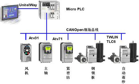 | 系统概述 细纱工序是成纱的最后一道工序,是将粗纱进一步牵伸30~50倍并加捻,纺成具有一定特数、符合相关质量标准的细纱,供捻线、机织或针织使用。传统细纱机的牵伸原理与粗纱机基本相同,而卷绕和加捻则是由钢领和钢丝圈来完成的。环锭细纱机和传统粗纱机一样由一台电机传动,通过齿轮箱变换各机构需要的速度。在环锭细纱机各组成部分中,牵伸系统是反映细纱机性能和影响纱线质量的最关键因素,而新型的紧密纺纱技术通过对牵伸部分进行创造性改造,将牵伸区和集合区分离,在环锭纺罗拉牵伸与加捻之间叠加对纤维须条的气动凝聚或集聚技术,增加了须条的紧密度,毛羽减少约20%,强力则提高约10%,同时,条干均匀度、机器效率等也有不同程度的提高,不仅可以降低加工成本,同时可以减少后加工工序。紧密纺的另一优点是与原细纱机完全一致,只多出一对集聚罗拉,在原环锭细纱机上也可进行改装,具有广阔的市场前景。 紧密纺细纱机的控制系统较环锭细纱机复杂许多,首先是前后罗拉的严格同步,实现牵伸倍数和捻度的精密控制,保证高支数纱线的成纱质量;其次是通过取消钢领板的传动齿轮,采用先进的伺服控制技术实现卷装的电子成形技术,从而实现了机械机构的简化、生产速度的提高、以及纱线支数和管纱成形的自动调节。 方案原理图 ![]() 图1 紧密纺细纱机传动方案原理图 在紧密纺细纱机的控制系统,采用了三套施耐德电气公司的Twin Line系列伺服驱动系统和无刷伺服电机,分别控制前、后罗拉以及钢领板;采用1台ATV71变频器控制主传动电机,采用1台ATV31变频器控制风机;整个系统采用Micro PLC控制,Micro PLC与变频器及伺服间采用高速CANopen总线进行通讯,同时采用XBT-G 5.7”黑白触摸屏进行系统操作和监控。 Micro+ATV71+ATV31+TWLIN+XBTG方案硬件配置