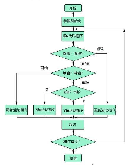 图3基于直线电机的开放式数控系统原理图 该系统采用在PC机的扩展槽中插入运动控制卡的方案组成,系统由PC机、运动控制卡、伺服驱动器、直线电机、数控工作台等部分组成。数控工作台由直线电机驱动,伺服控制和机床逻辑控制均由运动控制器完成,运动控制器可编程,以运动子程序的方式解释执行数控程序(G代码等,支持用户扩展)。运动控制卡型号为PCI-8132。 当今的工业控制技术中PCI总线渐渐地取代了ISA总线,成为主流总线形式,它有很多优点,如即插即用(Plug and Play)、中断共享等。PCI总线具有严格的标准和规范,这就保证了它具有良好的兼容性,可靠性高;传送数据速率高(132Mbps)或(264Mbps); PCI总线与CPU无关,与时钟频率无关,适用于各种平台,支持多处理器和并行工作;PCI总线还具有良好的扩展性,通过PCI_PCI桥路,可进行多级扩展。PCI总线为用户提供了极大的方便,是目前PC机上最先进、最通用的一种总线。PCI-8132是具有PCI接口的2轴运动控制卡。它能产生高频脉冲驱动步进电机和伺服电机,控制2个轴的电机运动,实现直线和圆弧插补。在数控加工中,提供位置反馈。 系统软件在WINDOWS平台上开发。该软件采用模块化程序设计,由用户输入输出界面、预处理模块等组成。用户输入输出界面实现用户的输入、系统的输出。用户输入的主要功能是让用户输入数控代码,发出控制命令,进行系统的参数配置,生成数控机床零件加工程序(G代码指令)。预处理模块读取G代码指令后,通过编译生成能够让PCI-8132运动控制卡运行的程序,从而驱动直线电机,完成直线或圆弧插补。读取G代码的过程是首先进行参数的设定,然后读取G代码,该程序流程如下如图4所示。